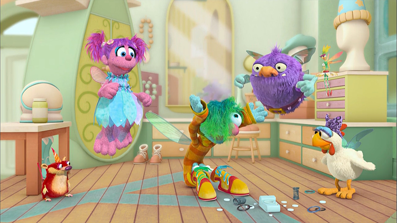 Muppets / Animation | Abby's Flying Fairy School Today is Picture Day, and all the students have made themselves up nice, except for Gonnigan, who's having a bad hair day. Abby conjures up some "Rapunzel-Brand Hair Gel" and, because he has so much hair, uses the whole container on him. While it makes a suave hairdo at first, it soon begins to grow out of control (while Blogg measures its length using Niblet). Abby tries using a baret and Blogg uses a stove-pipe hat to control his hair, but it ends up getting even longer and grabbing hold of everyone. After a twinkle-think, Abby conjures up Papino the Pixie, a barber who cuts his hair to normal length and the class takes their picture. (First: Episode 4260) |