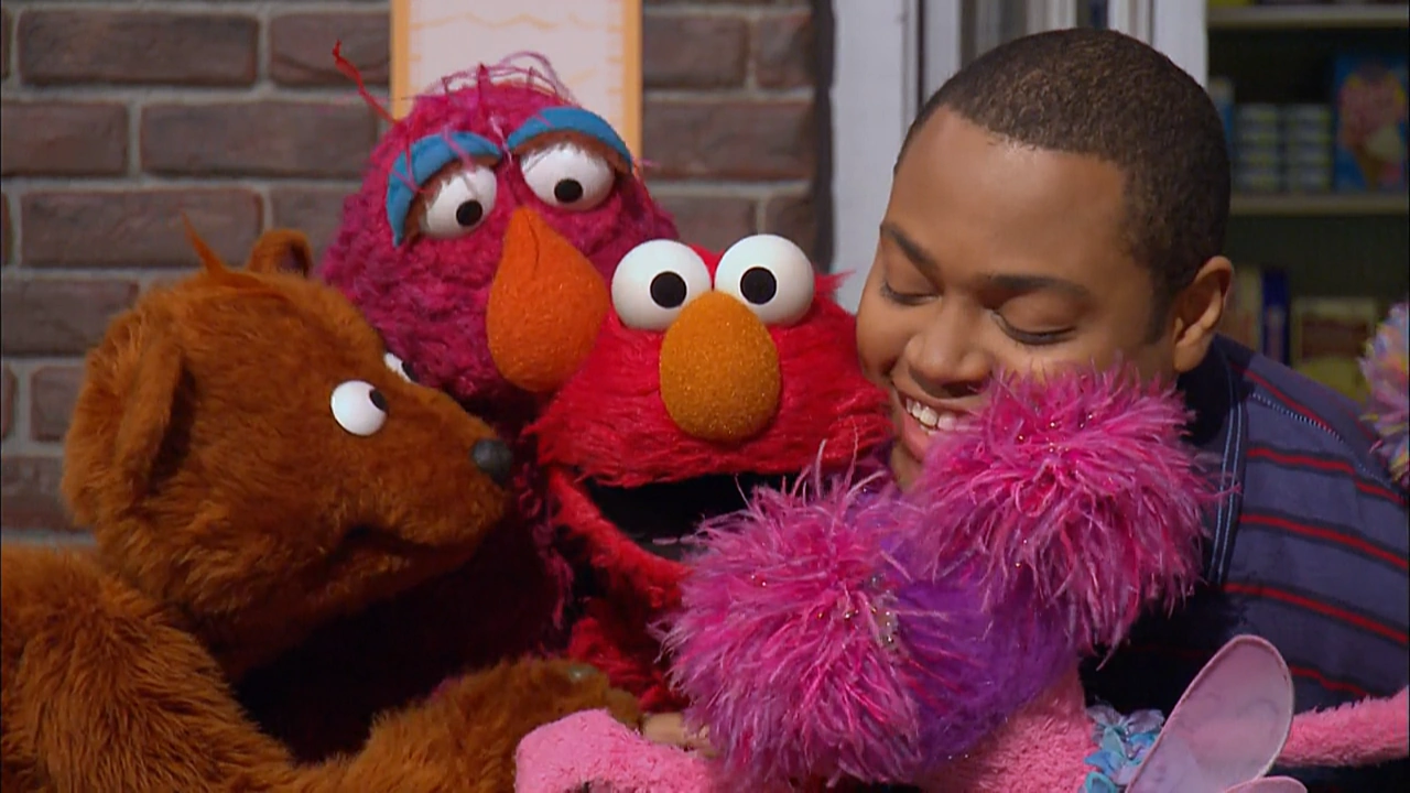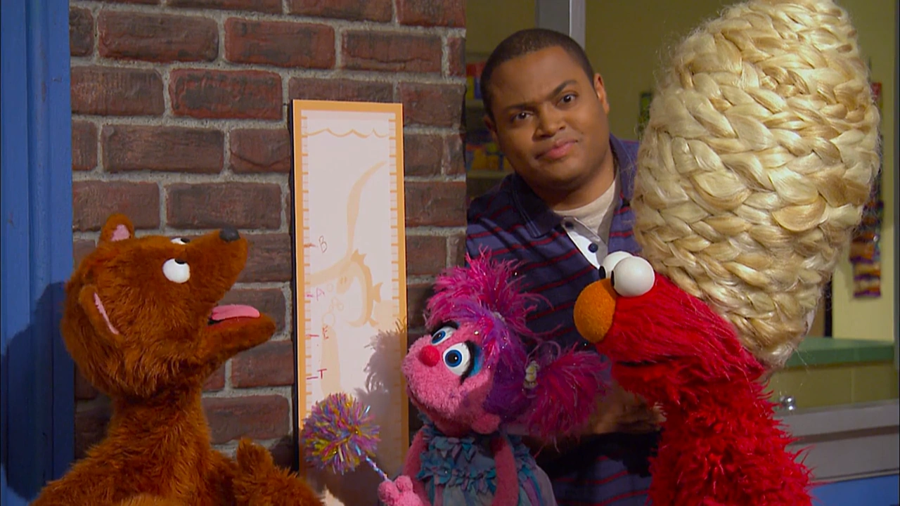 SCENE | Outside Hooper's Store, Chris measures Elmo, Abby, Telly and Baby Bear with a growth chart. Elmo is shocked to find Abby's now a little taller than him; he's always been taller than her. He feels upset he's the shortest of the group now, but thinks he has a way to fix it. Elmo runs off and returns with a giant wig, thinking it'll make him taller. However, Chris removes it and they all notice the high-heel shoes he's also wearing. |
