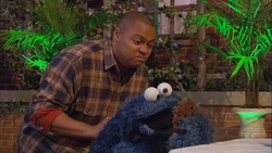 SCENE cont'd | Cookie doesn't know what to do. Chris points out out his options - he can eat one cookie, or he can join the club and get to eat many cookies. Cookie decides to keep his cool to stay in the club. He makes it through the club process, discovering the aspects of cookies he never experienced, thus making him a member and allowing him to eat his cookie whole. Alan brings out a tray of shortbread cookies, a kind Chiphead hasn't had in years. In Cookie Monster fashion, he scarfs down as many as he can, until he realizes how he's acting. Cookie Monster offers to help him with his self-control problems. |
