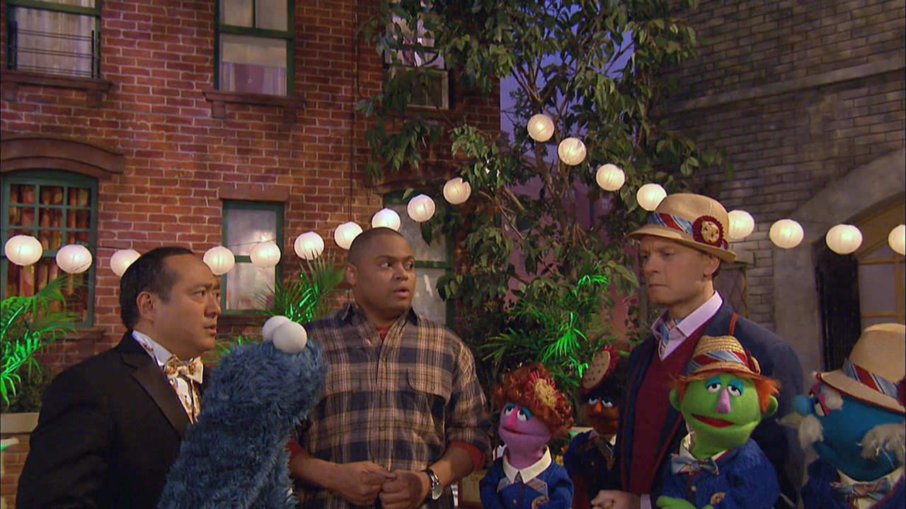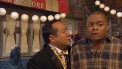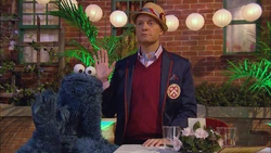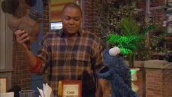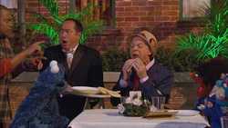 SCENE | Chris returns from a hiking trip and finds Hooper's Store filled with cookies and the yard decorated in fancy restaurant fashion. Alan explains that the Cookie Connoisseurs Club is visiting to have a cookie tasting session (similar to a wine tasting) after sampling the cookies he sent them. He shows Chris the menu selections, as well as the appropriate milk options. Chris reminds Alan that if Cookie Monster catches wind of this, he'll tear the place apart. Alan is not worried; Cookie's visiting his aunt in Sacramento. |