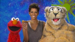 Muppets / Celebrity | Elmo brings Halle Berry some animals to nibble on her snacks. The bird and fish take large bites, while the ferocious tiger takes a tiny bite. |