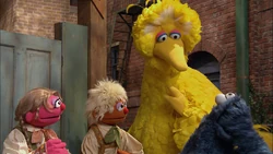 SCENE cont'd | With their trail in place, they call Big Bird to begin playing. However, Cookie Monster pops up, having eaten the entire trail. The two begin to fret that they'll never find their way back, and Big Bird suggests they make a new trail and leads them back to the subway, listing all the directional landmarks along the way. |
