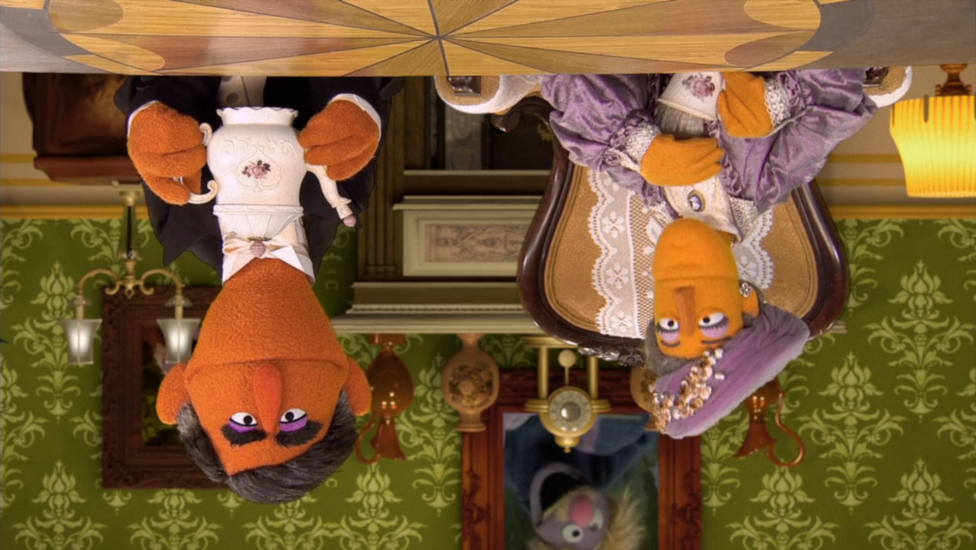 Muppets | Upside Downton Abbey Farson tries to serve Lady Schmanthum of Upside Downton Abbey, but she's baffled when all the food items fall to the ceiling. Farson points out it's because they're upside down. The countess initially refuses to make things right-side-up ("It is simply not done."), but changes her mind eventually. Farson whips out a lever that sets thing right-side-up and causes the countess' steak and kidney pie to fall on her head. |