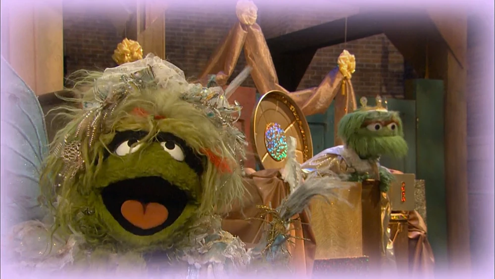 SCENE contβd | In Abbyβs imagination, she tells what she thinks is Oscarβs fairy tale origin. He once was a handsome, kind prince who received trashy treasures from his subjects, until one day, a Fairy Grouchmother witness this and was disgusted. With a wave of her wand, she turns him into a nasty Grouch. |