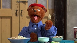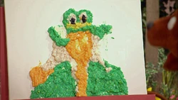 SCENE cont'd | With Telly in costume and the porridge prepared, Baby Bear is ready to begin...only he hasn't the faintest idea what to do with the porridge. Another glow gives him the inspiration to paint with it. With the help of some food coloring, Baby Bear paints a likeness of the Q.D.M. in porridge and displays it on his easel. They call the Duck Man, who bursts through the re-made stack of boxes. Baby Bear then finds the porridge sliding off the canvas, ruining the picture! He and Telly hide it and assure the Duck Man his art will be ready soon. Once the Duck Man leaves, Baby Bear goes to his porridge from before for some brain food, but finds it's gotten all mushy. In another bout of inspiration, he decides to use it for his artwork. |