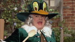 SCENE cont'd | Apparently, that's all it takes, as the Quacker Duck Man (Bobby Moynihan) appears, bursting through Alan's boxes (to his dismay). Baby Bear is too star-struck to point out he doesn't have any art, but Telly assures him he will soon. The Quacker Duck Man understands and vows to come right "quack" when they're ready. Alan offers to whip up a big batch of porridge for him to use and Telly offers to be his model. Baby Bear also leaves, to get his supplies. |