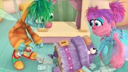 Muppets / Animation | Abby's Flying Fairy School Abby and Gonnigan work on their magic macaroni art. Blogg uses magic to create a life-size Macaroni dinosaur. With a touch of "The Spice of Life", he brings his creation to life. However, it begins wreaking havoc all over the class room, wrecking everything. They try various methods of stopping it, including making a Macaroni stop sign, but to no avail. Mrs. Sparklenose suggests they "Spot the solution." They call on Spot, who shows them things that are humongous. They get the idea they need something big to stop him. A large wall doesn't work for them, however. Blogg comes up with a giant meatball, which the Macaronisaurus begins playing with. Everyone cheers, while the giant meatball pins Blogg to the floor. (re-orchestrated theme song) (First: Episode 4207) |