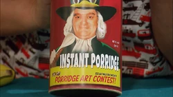 SCENE | Alan stacks some delivery boxes, then serves Baby Bear and Telly some porridge; Quacker Instant Porridge to be exact, Baby Bear's favorite brand. He notices the box is advertising a porridge art contest, which is art made from porridge (and edible). A heavenly glow appears, enlightening Baby Bear on a whole new way to enjoy porridge. Alan reads the rules, which states the art must portray the Quacker Duck Man and to enter, just call him. There's no phone number on the box and Baby Bear ponders aloud if all he has to do is yell, "Hey, Quacker Duck Man!" |