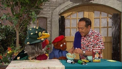 SCENE cont'd | Alan has secured his stack with rope and finds Baby Bear's made a near-perfect likeness of Telly, which is actually Telly encased in porridge! While the Duck Man struggles to get through the boxes, Alan points out that Baby Bear shouldn't cheat and they get Telly out of the porridge. The Duck Man is unfazed by his lack of art and promises to return once more. Baby Bear sees porridge can harden and thinks he can make a sculpture with it. Alan shows him how they can make dryer porridge without having to wait. |