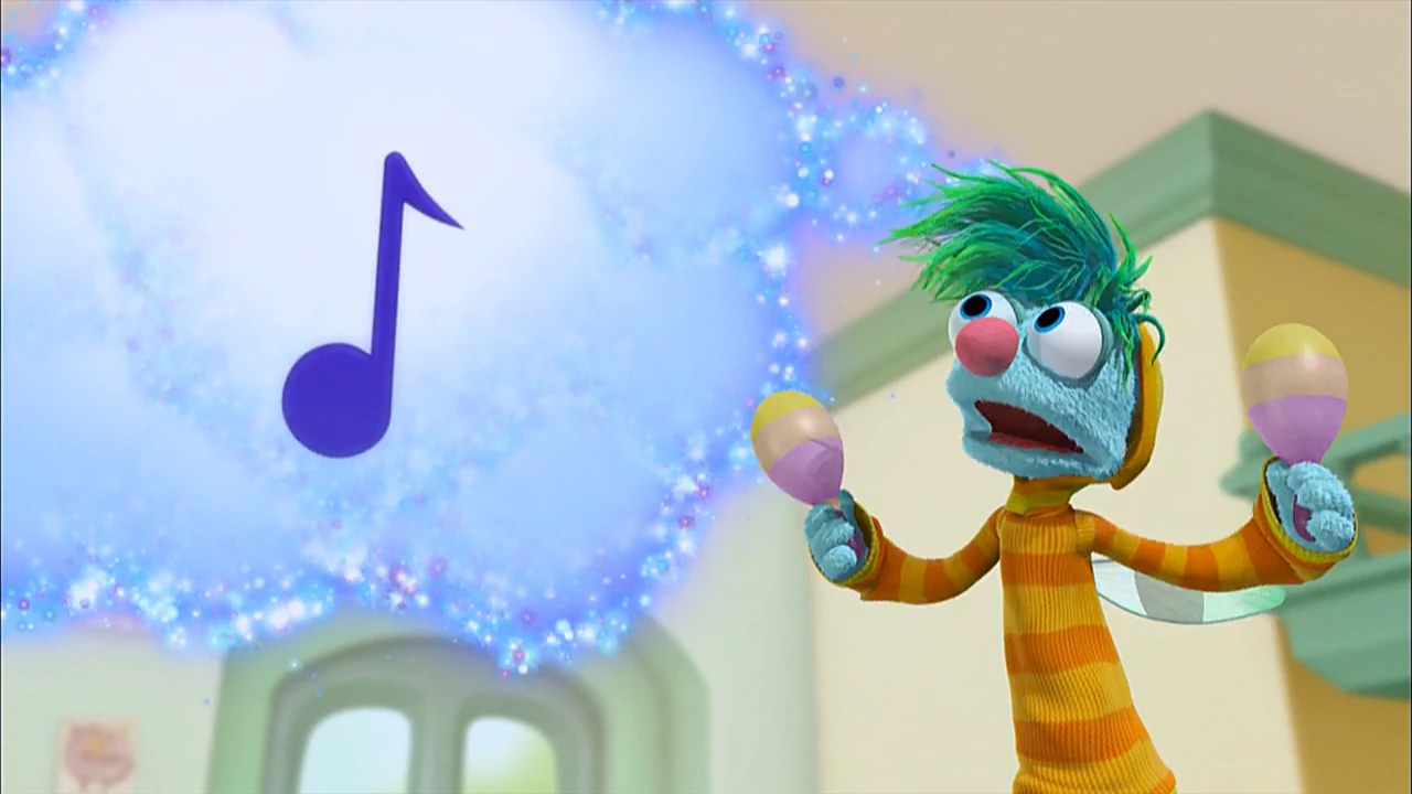 Muppets / Animation | Abby's Flying Fairy School The students are in the middle of music class, but the music they make isn't too great. Abby requests they just use magic to play their instruments, but Mrs. Sparklenose says practice is the right path. A flying boombox swoops in the window and they press "play," releasing Morty the Musical Muse (who speaks in rhyme). Before he can leave, they must pass his three challenges. With a wave of his baton, Abby's trombone flies out of control. In order to get down, she must change the pitch; by playing high notes, she goes higher, and by playing low notes, she makes it back to the ground. Next, Gonnigan's maracas shake violently, quaking the entire school. To stop them, he needs to change the tempo. He discovers that means fast and slow and is able to stop the shaking by moving them slowly. Finally, Blögg's drum starts bouncing on top of him and he must change the dynamics of the music (how loud and soft). Blögg grabs the drum and plays it softly, sedating it. The students have learned many new things about music and Morty takes his leave. The kids decide to apply their knowledge and make music instead of having snack time. (First: Episode 4265) |