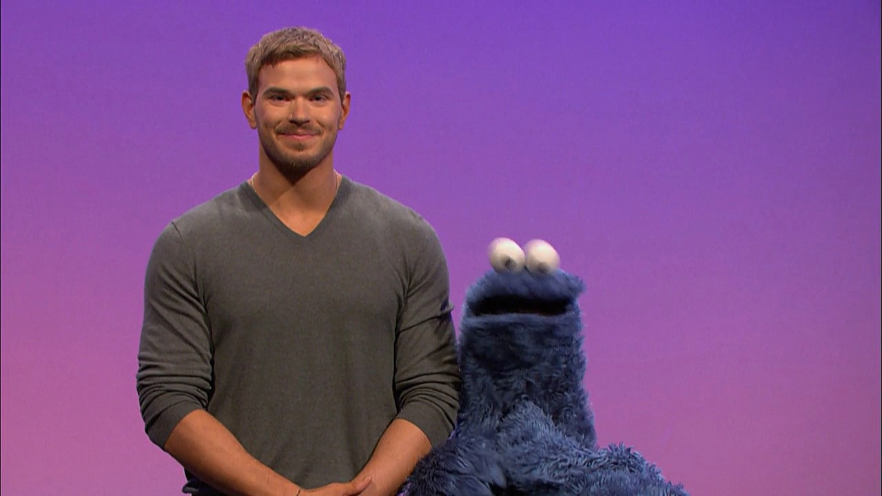Muppets / Celebrity | Kellan Lutz shows Cookie Monster things that vibrate, though he would rather go out for cookies. Kellan pulls out his cell phone, which Cookie devours; it soon vibrates from within him. |