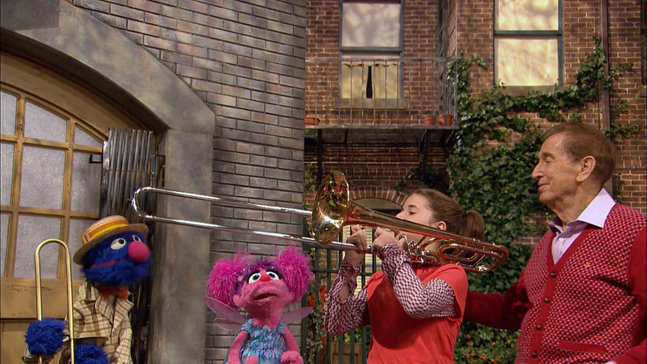 SCENE cont'd | Grover now pulls out a "tootle-tooter," a.k.a. a trombone. Bob has Lauren show them how it works and how vibrations come into play when using it. Grover tries to sell the 76 of them he has in stock, but Abby still wants to see her other options. |