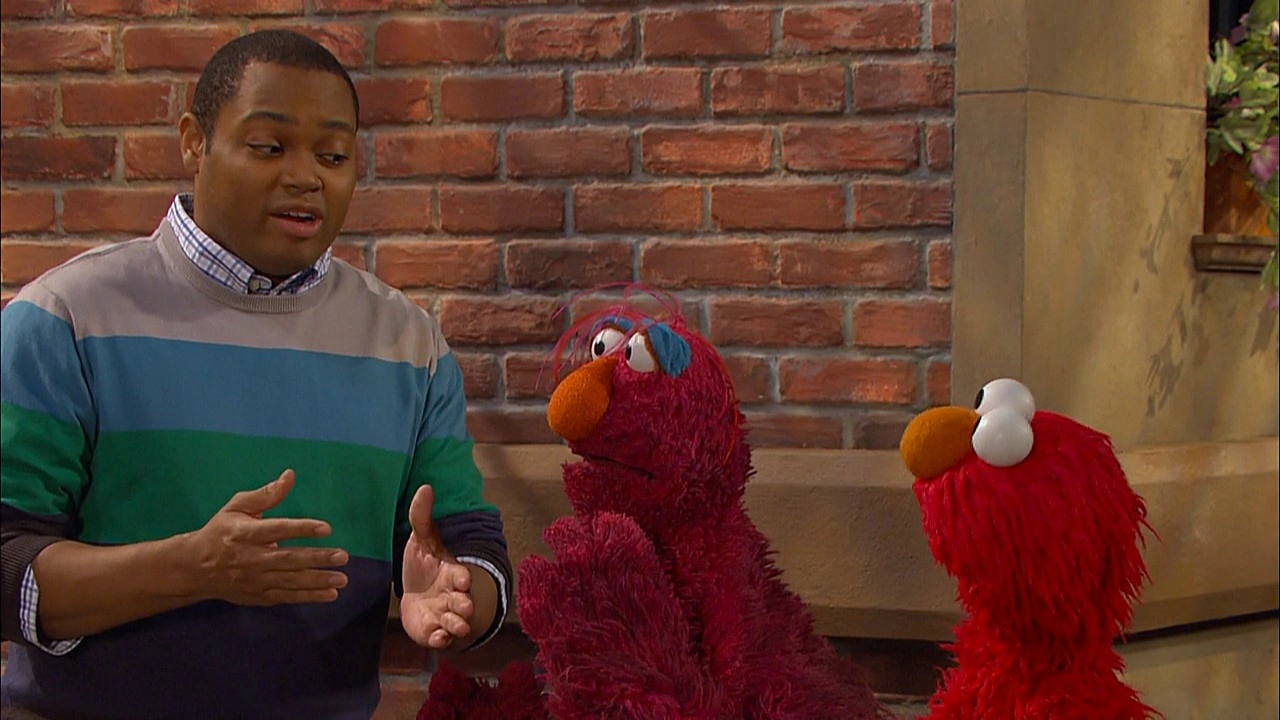 SCENE | Kids, monsters and sheep of all kinds are preparing for the local "Simon Says Competition." Telly welcomes the viewer and introduces the representative from Sesame Street: Elmo! Elmo and Chris explain he can't participate; the game's only for kids between 4 and 10 (Elmo's only three and a half). Telly's old enough and they suggest he play, but he declines, claiming he's not good at it. Chris leads them in a practice game and Telly loses quickly. He doesn't understand the point of the game; "It's not like Simon is a real person we have to listen to, right?" |
