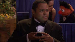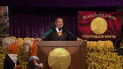 SCENE cont'd | Elmo comes up to the podium now and almost blows the ruse with his third-person speech pattern, until Maria claims it's his Spanish nickname ("El Mo"). Elmo successfully passes the test by counting the pickles by two. However, the judges can't give him the prize; according to his profile, thunder and lightning always follow his counting and they didn't hear any, and they don't accept Alan, Chris and Telly making "boom" sounds behind their programs. Telly pleads with the judges, pointing out that the Count has taught millions of people how to count and his counting has made people happy. But, rules are rules and if he's not here, he can't get the prize. Suddenly, all of his friends in the audience rise up, in full Count-ensemble, claiming they're the Count. The judges see the Count is a special figure on the street, but they still cannot give him the prize, and instead award it to the second greatest counter: a hand-held calculator from Beijing. Chris texts the Count about his loss, who replies that it's better to count friends who care about you than prizes. |
