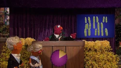 SCENE cont'd | The judges introduce the Count again and out comes Alan, pretending to be him (cape, monocle, beard and all). The judges are skeptical at first, but proceed with the test: he must count the dancing pickles that appear behind the sign. Alan has trouble counting them all and blows it. To save the Count's reputation, Chris claims Alan's actually the Great Impostor of Sesame Street. Alan shuffles off doing his Gladys the Cow impression. The judges allow one more minute for the Count to arrive. Leela and Gordon approach Chris on the Count's whereabouts and he receives another message from him, now counting the announcements about his delayed flight. Telly claims they need someone who can count really fast and has someone particular in mind... |