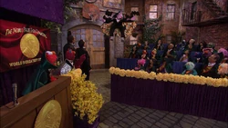 SCENE cont'd | As the ceremony begins, the judges introduce the Count, but he does not appear. Chris tries messaging the Count, who replies saying he was helping a counting emergency in Chicago and now his flights are delayed. He even counts the delayed flights and transmits his trademark thunder and lightning through the texts. They tell the judges of his delay and ask to leave the prize with them and they'll give it to him. But, the Count must be present, as he has to pass a final counting test in order to receive his prize. Not wanting him to lose the prize, they promise he'll be here in a minute. Alan has an idea... |