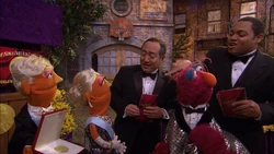 SCENE | Alan, Chris and Telly welcome the viewer to a special evening on Sesame Street: the Count is receiving the Noble Prize for Counting (being the best counter in the world), and everyone on the street has gathered for the ceremony. The two judges, Lars and Sigrid, wish for a quick ceremony, as they have to present an award to the winning whistler in Wichita in two hours. |