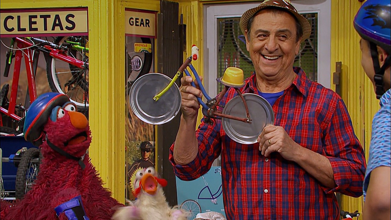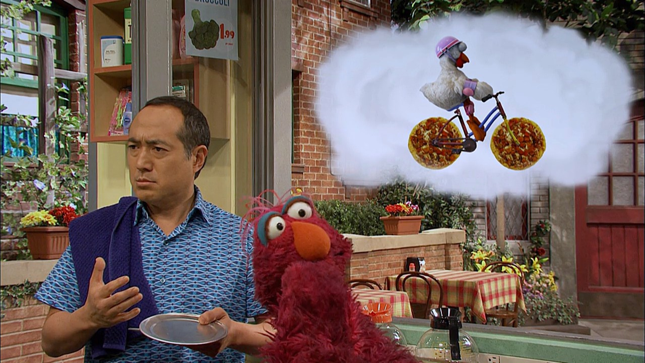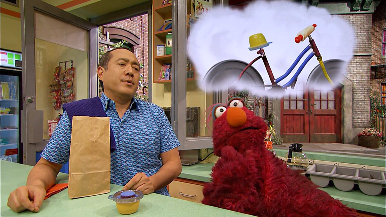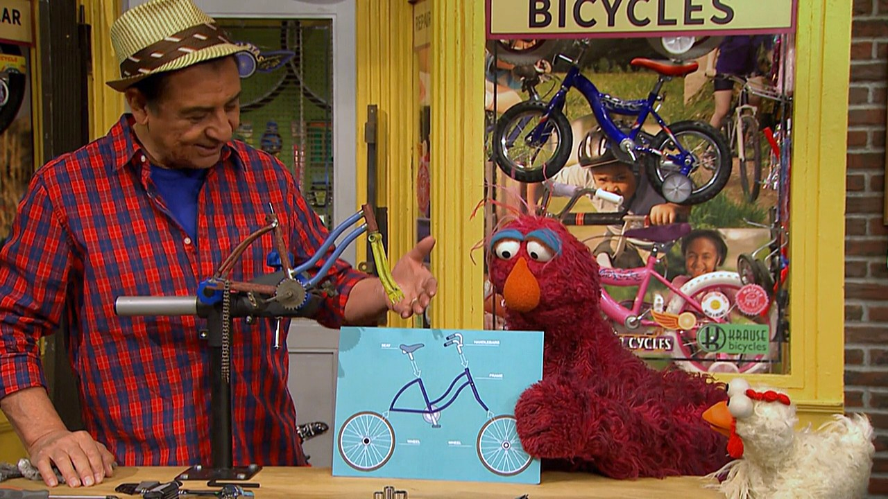 SCENE cont'd | Telly and Little Chicken think the bike is completed, but Luis points out there's one more thing missing - the seat. Little Chicken gets frustrated, so Telly runs off one last time. At Hooper's, Alan packs a lunch when Telly appears. Telly eyes the "to-go" container and Alan immediately lets him have it. |