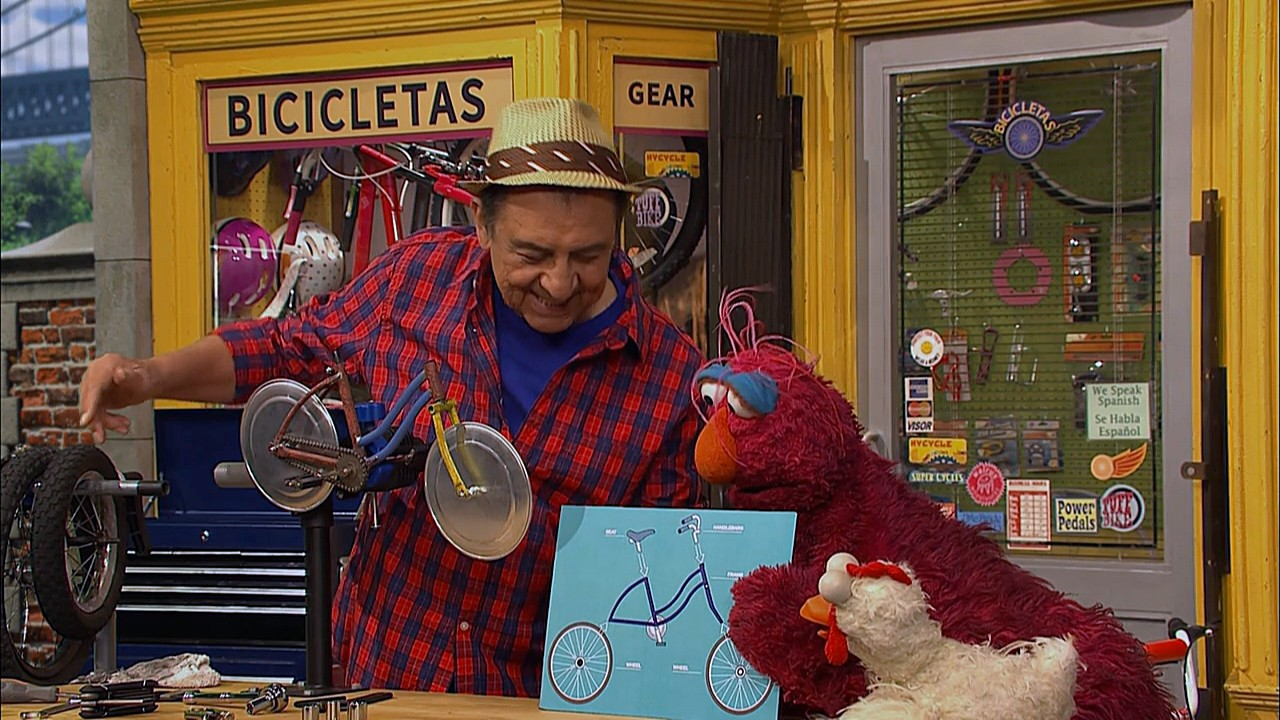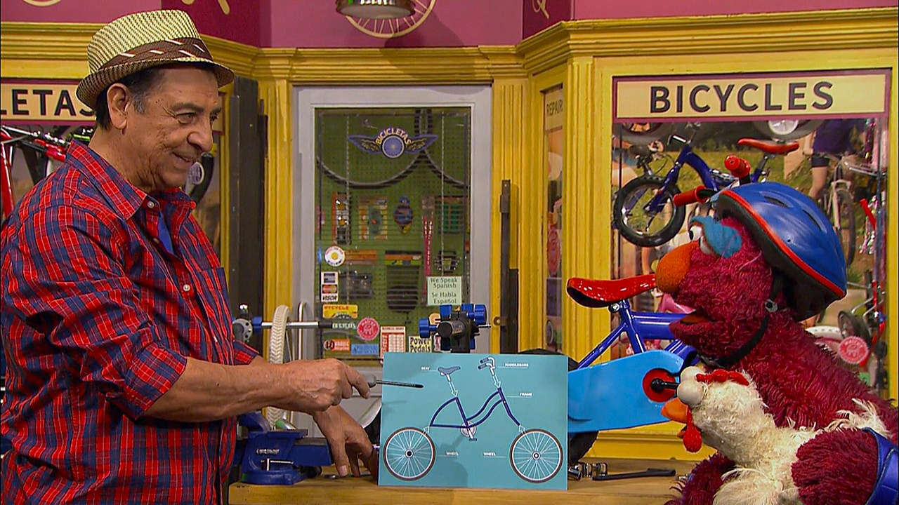 SCENE | Luis makes some adjustments to Telly's bike, when Little Chicken appears, hopping around with glee. Telly interprets her actions and determines she's excited for a bike ride. However, Luis doesn't have any bikes that are small enough for her to ride. Little Chicken gets sad, until Telly proposes Luis build her a bike. Luis pulls out a diagram of a bike, but thinks some problems will arise when building it. |