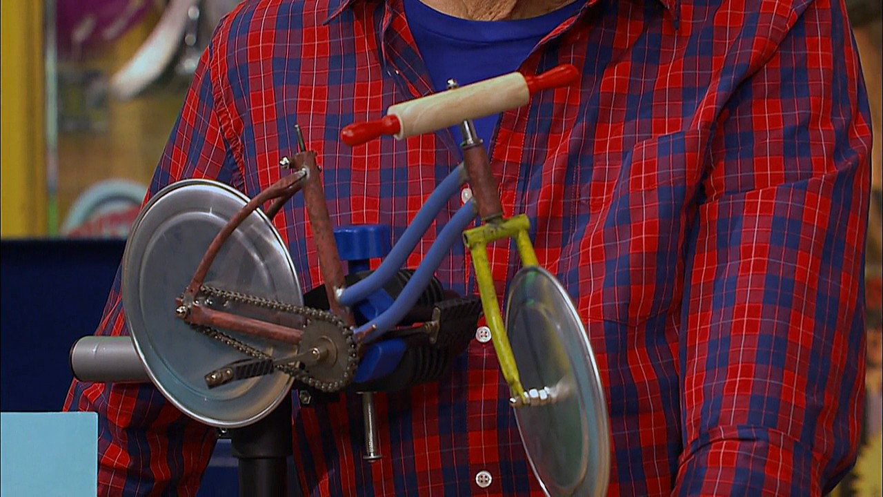 SCENE cont'd | Luis finishes up making a bike frame from spare parts. Telly and Little Chicken celebrate the finished bike, when Luis points out they're still missing some parts - wheels, handles and a seat. Telly sets out to find some wheels first. He runs into Hooper's Store, where Alan serves Gina and Leela some personal pizzas. Telly imagines using the pizzas for wheels, when he realizes the pans would work much better. He borrows them from Alan, stating they'll be used to make a chicken happy. |