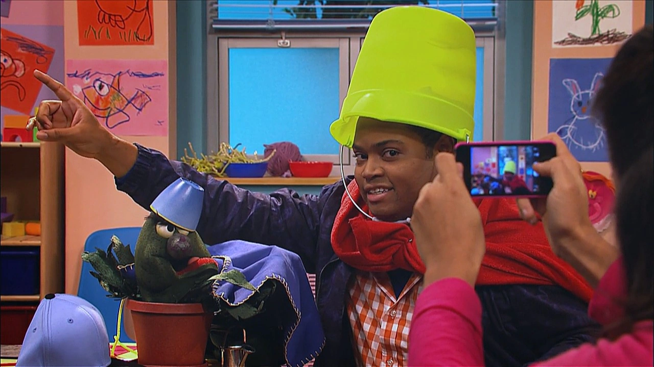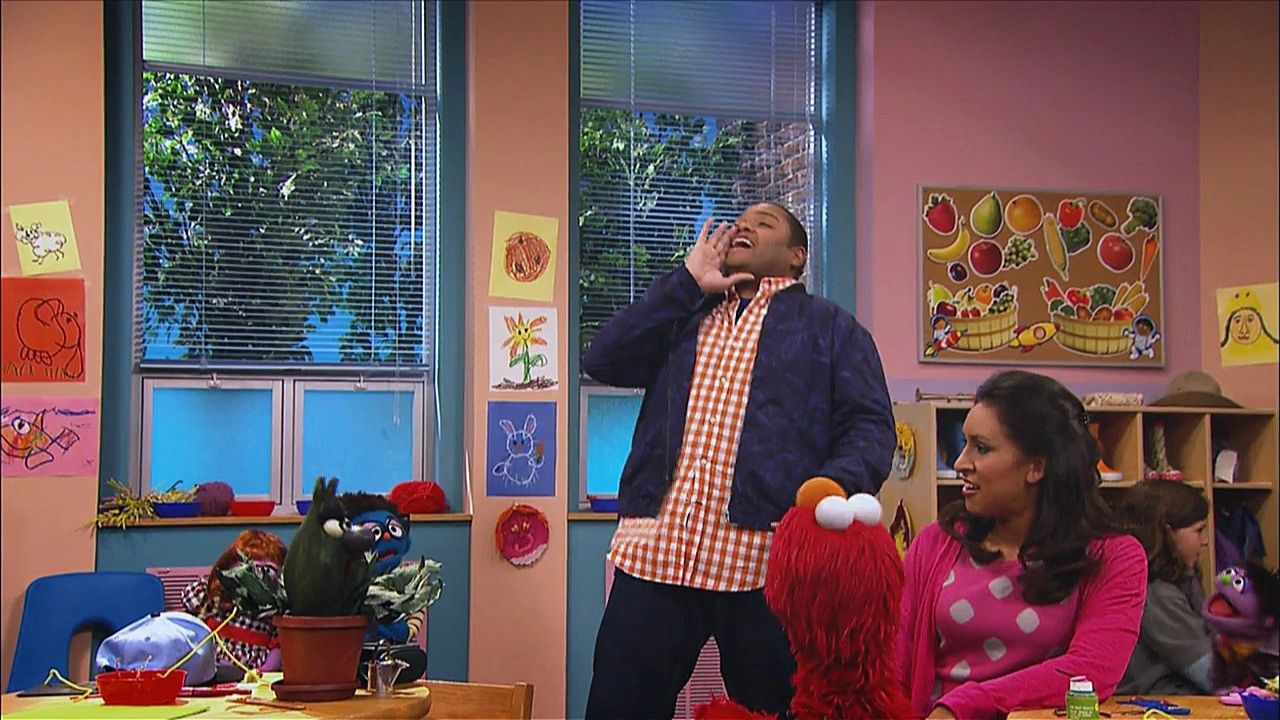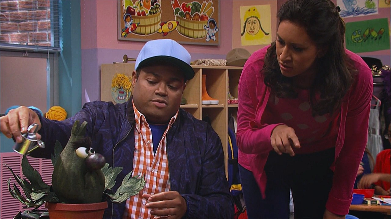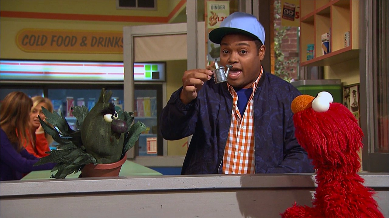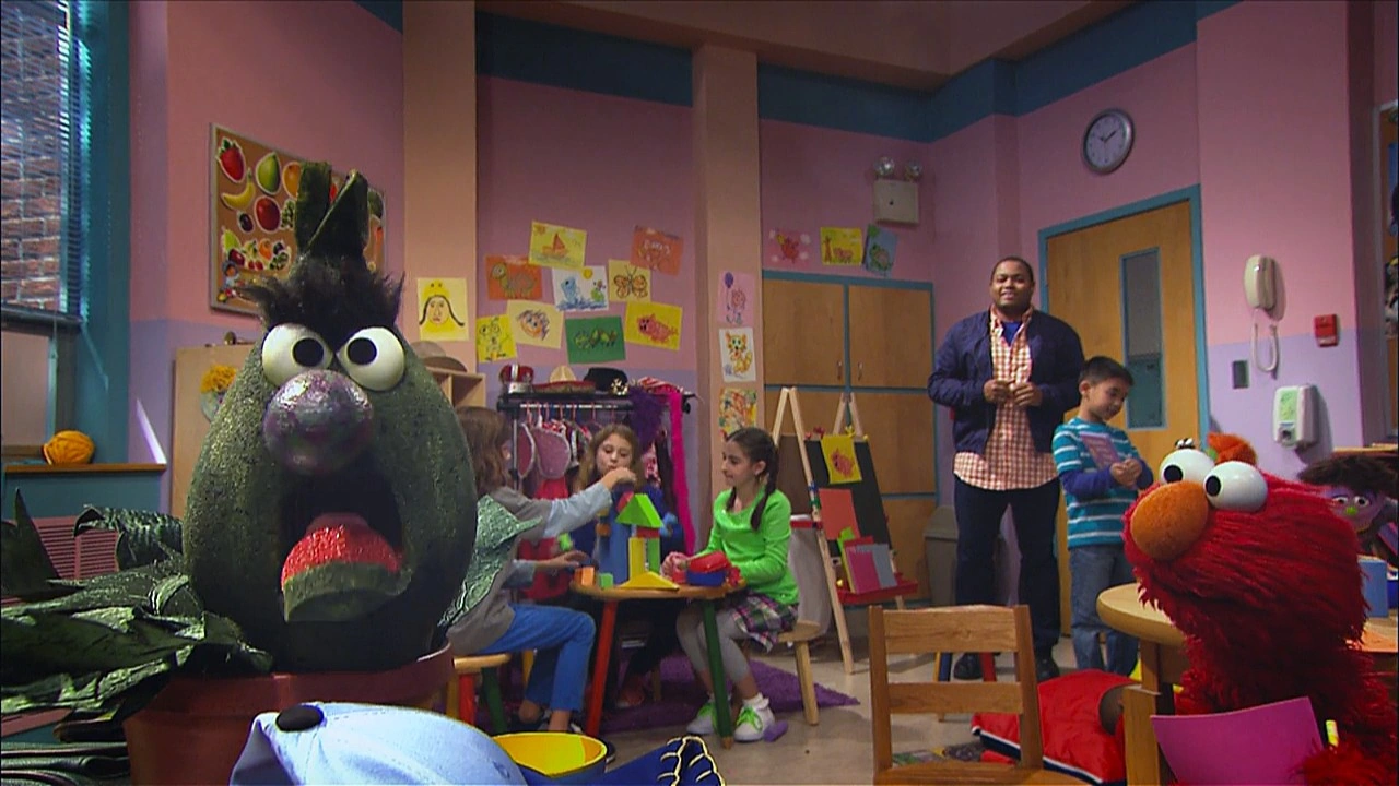 SCENE cont'd | They all arrive at school, but Stinky is hesitant to enter the classroom; he's worried no one will like him. They bring him inside and Elmo introduces everyone to him, including the teacher Mrs. Sanchez (Jasmine Romero). She's even set out a special spot for him with plenty of sunlight. Chris is about to head back to work, when Stinky bugs out; he doesn't want Chris to leave! Chris assures him Mrs. Sanchez can do the watering and feeding the same way he does, but Stinky still feels scared and nervous - he's anxious! |