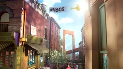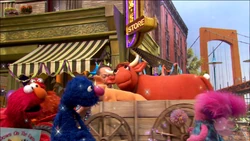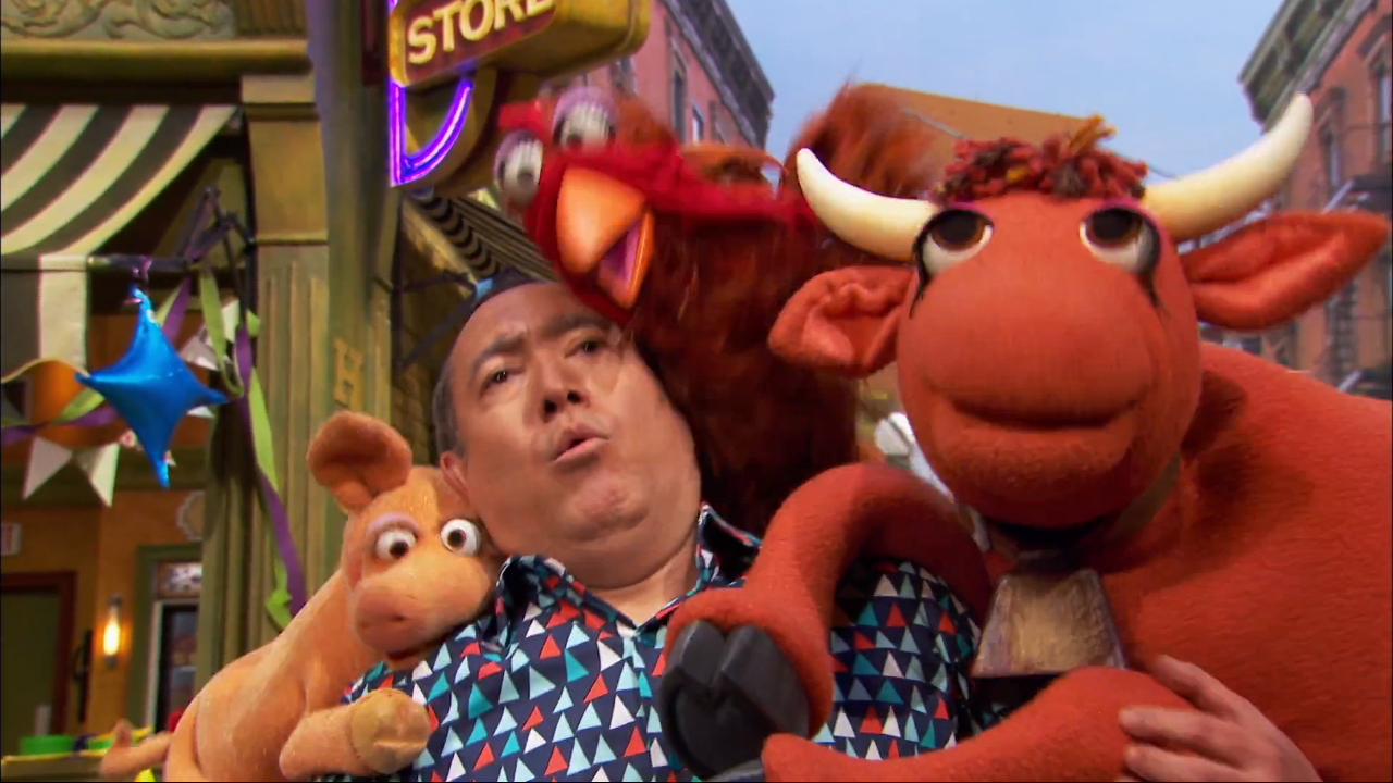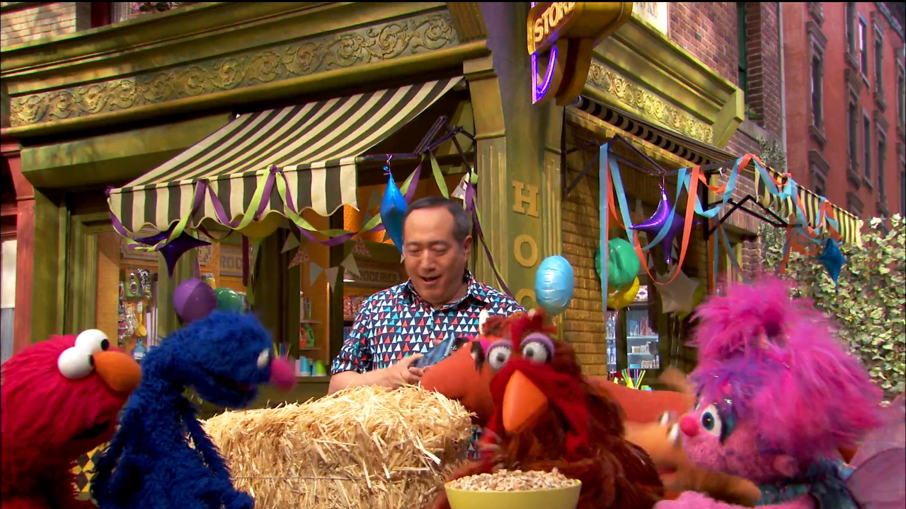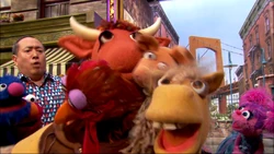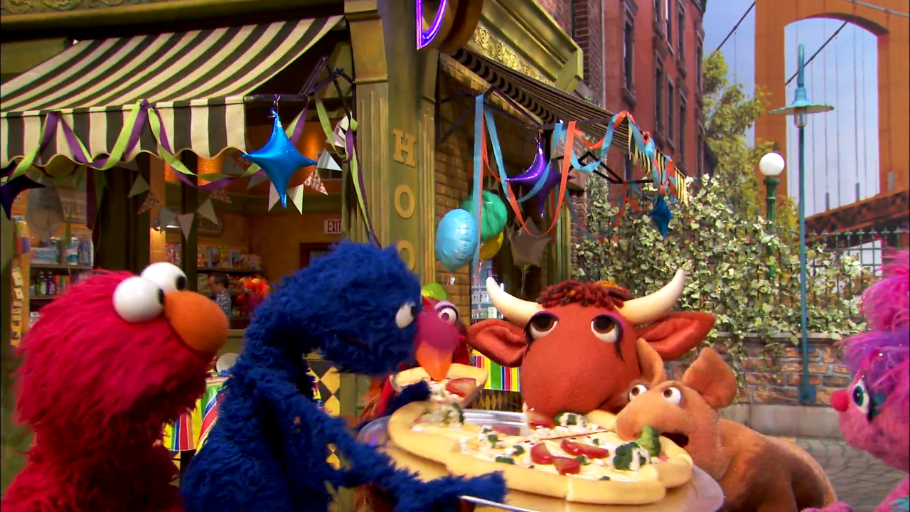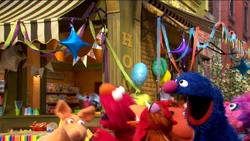 SCENE | Elmo and Abby notice the exterior Hooper's Store is covered with decorations (which is unpleasant to Oscar). They see Grover adding more to the area, tossing balloons, snacks and confetti everywhere. He explains he's throwing a "farm fiesta," a party for farm animals. He's certain that since everything seems pleasing to him, the animals will like it too. The farm animals (a cow, a pig and a chicken) arrive and the gang surprises them, causing the animals to panic and separate. Grover doesn't understand what's happening and Abby points out that he needs to think of what the animals might like over his own interests. They call the animals back by imitating their sounds. |