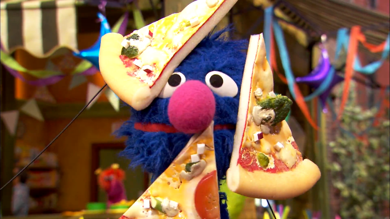 SCENE cont'd | Now that the animals have returned, the party can begin! Grover first brings out some farm fiesta food - a pizza. The animals take a taste, but immediately turn on it (spitting out their slices back at Grover). Abby and Elmo remind him to think about the animals' interests, though Grover doesn't know what they eat. They call out Alan, who looks up their primary diet on his phone - grain and hay. Abby conjures some up and the animals dig in. |
