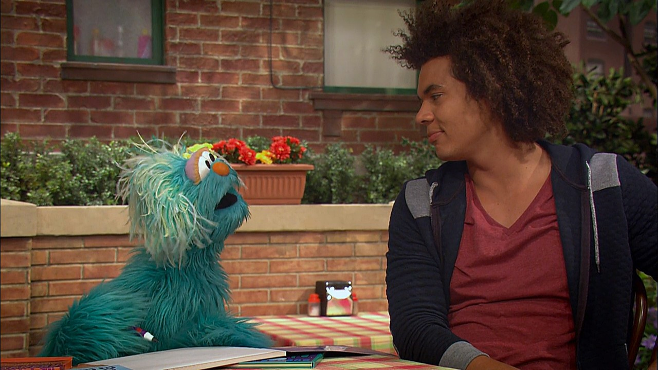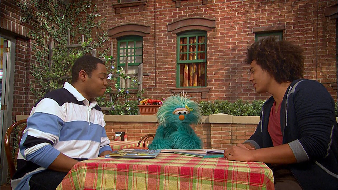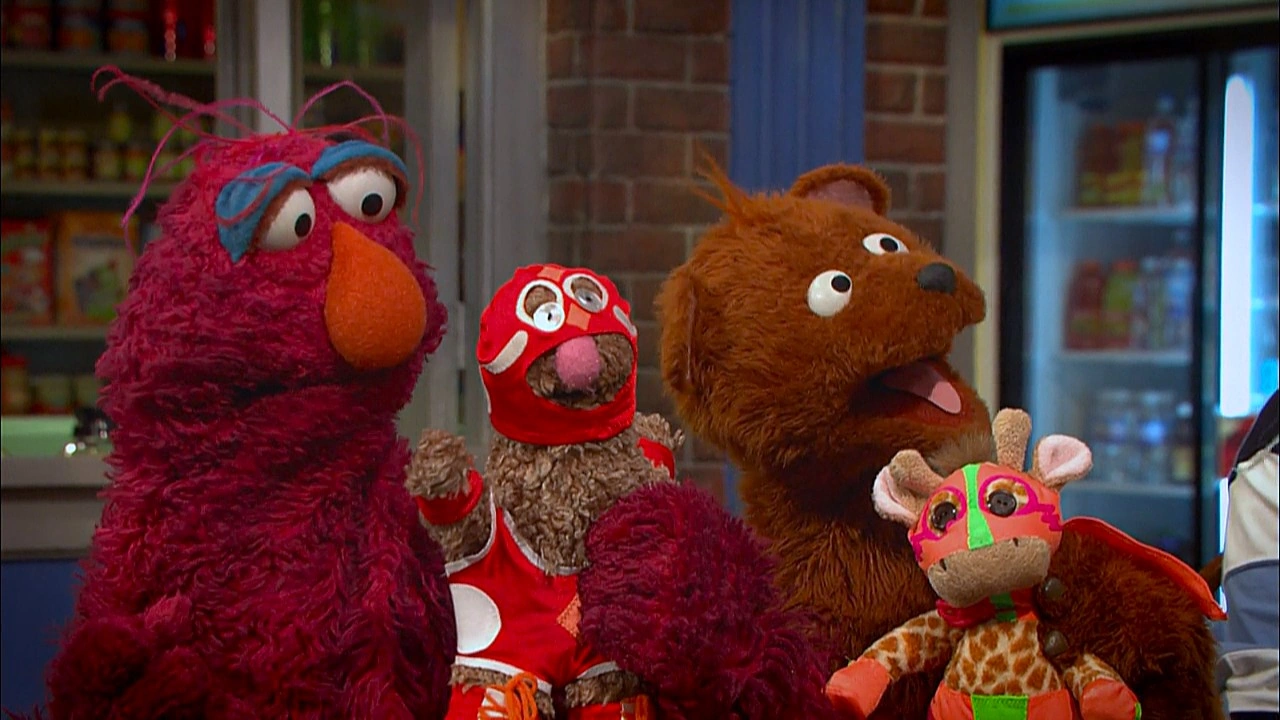 SCENE cont'd | Telly and Baby Bear now show up, showing off how they've dressed their dolls like luchadores and ask her to play Lucha Libre (Mexican wrestling) with them. Rosita declines their invitation and continues to struggle with her book. Mando and Chris make her realize everything that's just happened was how she integrates her Mexican heritage into her life on Sesame Street. Inspired, Rosita runs off to write. |