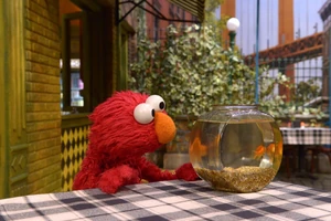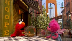 SCENE cont'd | Elmo doesn't think they'll ever find Dorothy, but Abby encourages him to think of another clue. Elmo believes they can find her if they look specifically for a fish that's orange. Elmo and Abby swim back to Hooper's Store (rendered as a sunken ship), where they find Dorothy swimming around the wreckage. They return Sesame Street to normal and order some lunch, discovering Chris is still stuck with a merman tail. |
