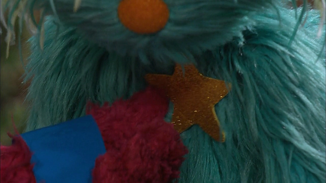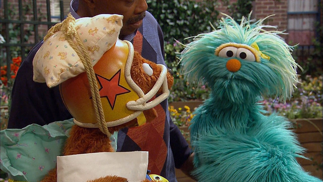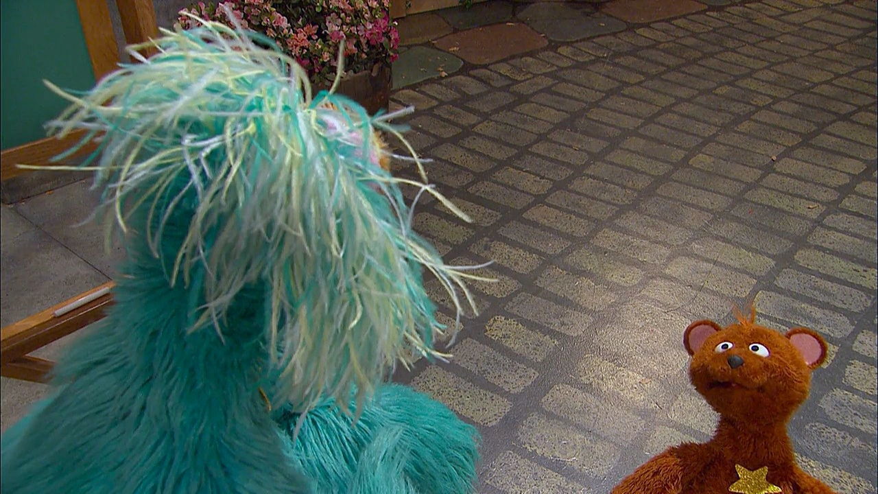 SCENE cont'd | Baby Bear is done with being pushed and quits the game. Rosita can't help herself and needs a way to prevent herself from pushing Baby Bear. Since Telly's not a real teacher, they call Gordon over to help. He has a musical suggestion: whenever she feels like pushing someone, she should "Hug Yourself." Baby Bear pads himself for the remainder of the game and Rosita finds the hugging advice works. She gives Baby Bear a hug of his own, as they all (including Gordon) start counting triangles. |