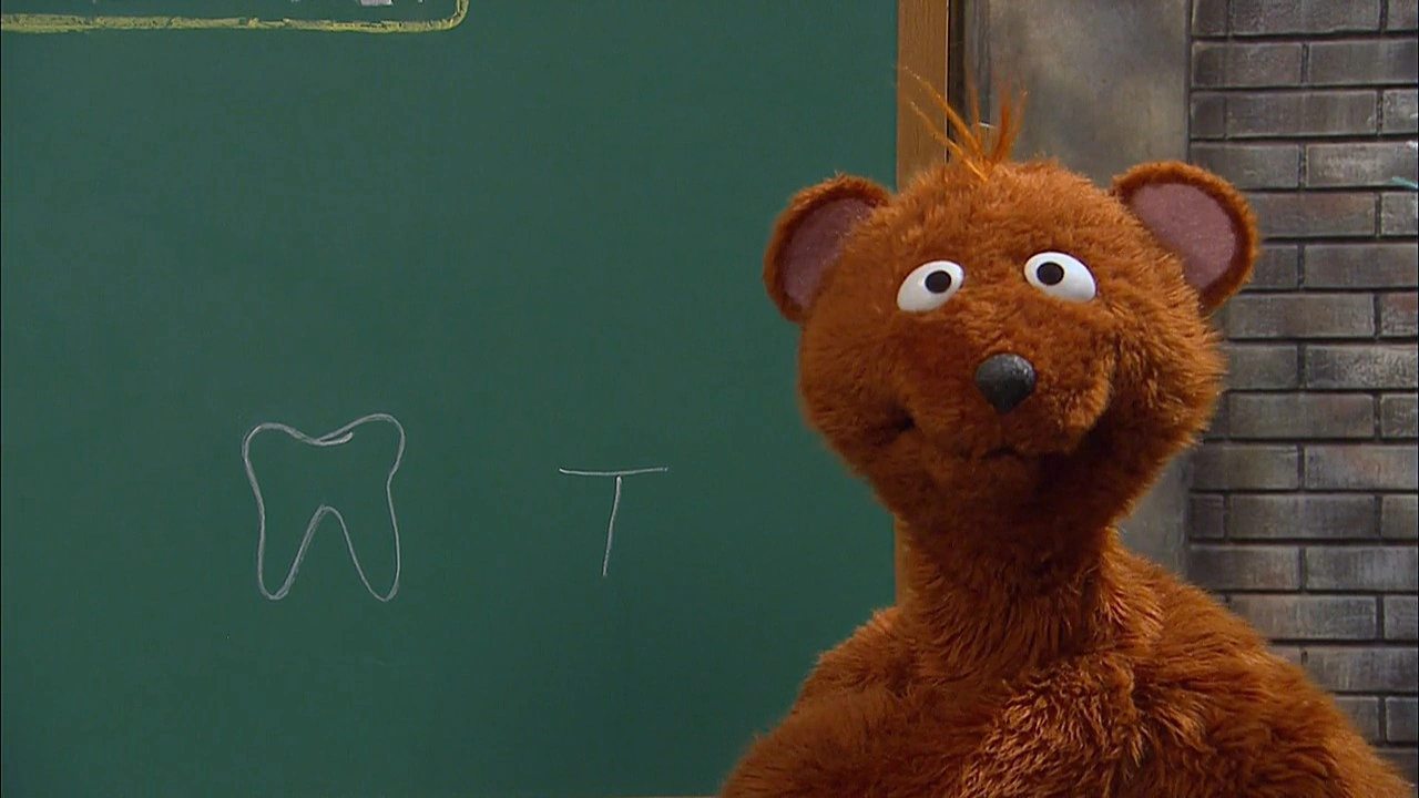 SCENE | Today, Telly, Baby Bear and Rosita are playing school, with Telly as the teacher. Gordon helps them set up before heading off. Teacher Telly begins his lesson on the letter T, which the two correctly make the sound of, earning them a gold star. |