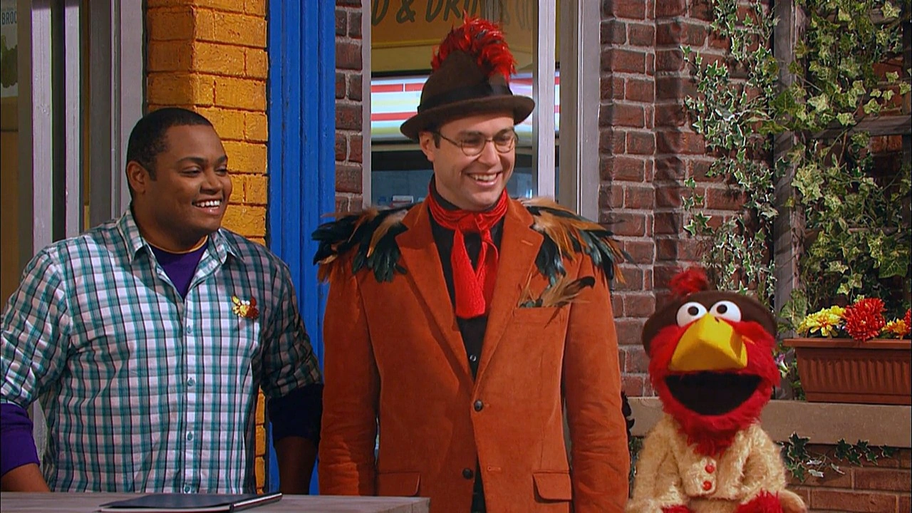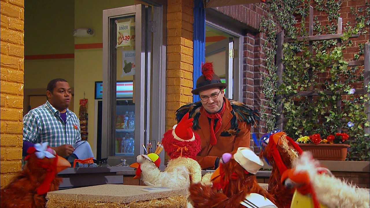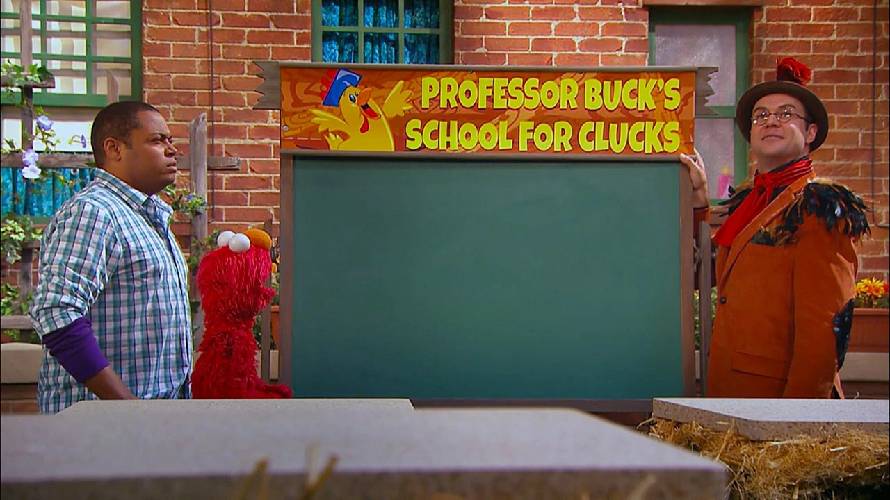 SCENE | Elmo notices somebody pushing a blackboard just outside Hooper's Store, so he and Chris go to investigate. Outside, they meet the man - Professor Buck Awe (Taran Killam) - who has set up "Professor Buck Awe's School for Clucks," the first (and only) free range chicken school. He proudly sings the school song just as the school bell rings. |