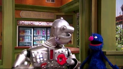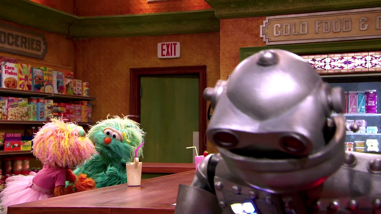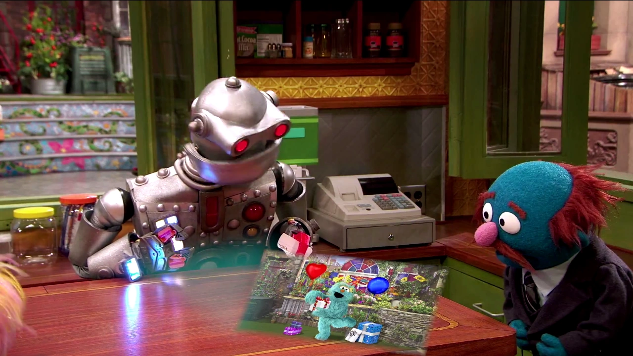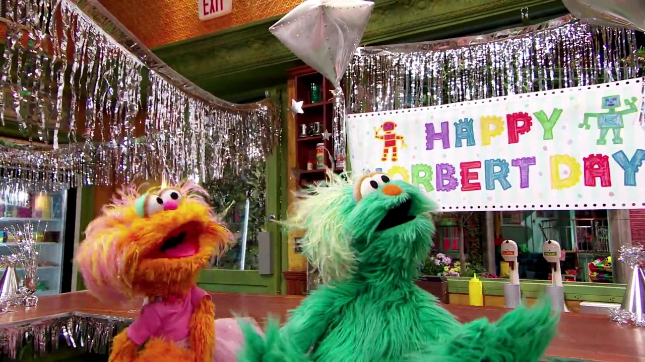 SCENE 1 | Norbert the Robot minds Hooper's Store in Alan and Chris' absence and serves Rosita and Zoe some drinks. Mr. Johnson comes in to order a birthday cake for his mommy. Norbert brings up some images of his friends' birthdays, but when asked about his own birthday, his database indicates he doesn't have one. Mr. Johnson confirms this; robots are made in factories, thus can't have birthdays. Norbert becomes sad, being the only one on Sesame Street unable to have a birthday. Zoe and Rosita decide to cheer him up with a surprise party. |