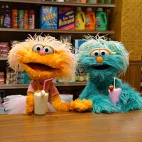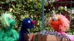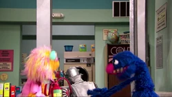 SCENE 1 cont'd | Zoe and Rosita have recruited Grover to help, having gotten their decorations. They find they're unable to set up inside Hooper's because of Norbert's watch, so Grover offers to distract him. He pretends to be missing his favorite periwinkle crayon and leads Norbert outside to find it. Norbert leaves "Gloria" and "Freddie" (the milkshake mixers) in charge while he's out, as Zoe and Rosita begin to set up. |
