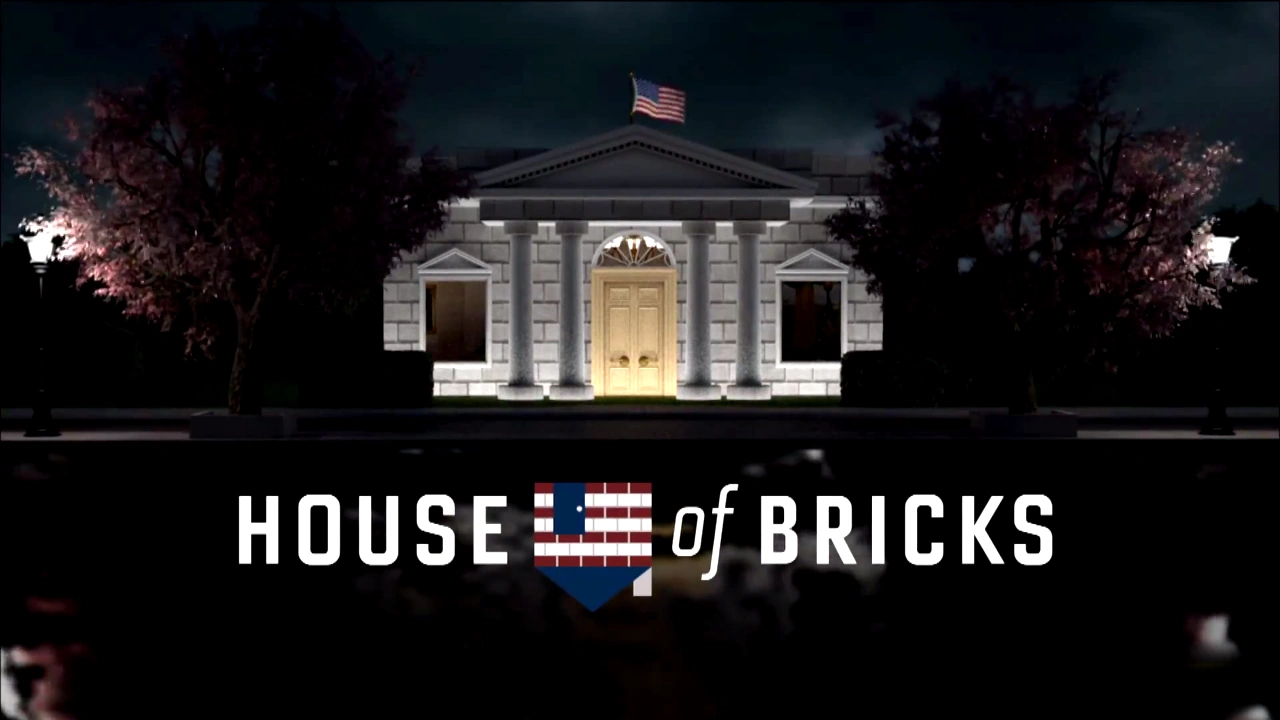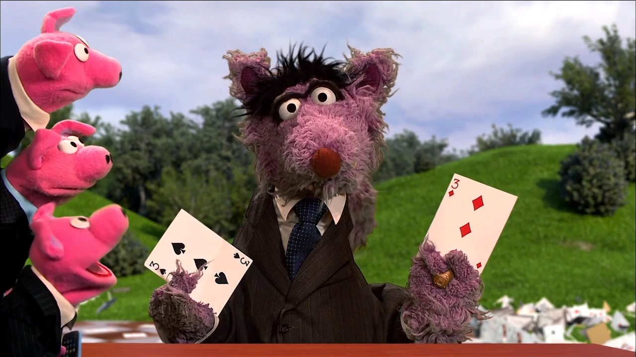 Muppets | House of Bricks Frank Underwolf wants to get into the White Brick House, with only Straw and Stick houses in his way. He scares off The Three Little Pigs from the houses, blowing them down and subtracting them as he goes. When he finally makes it to the White Brick House, the pigs let him have it without a fight. As he assumes his seat in the Oval Office, the pigs huff and puff and blow the house apart, revealing it was merely a house of cards. (First: Episode 4519) cut from the Max version |