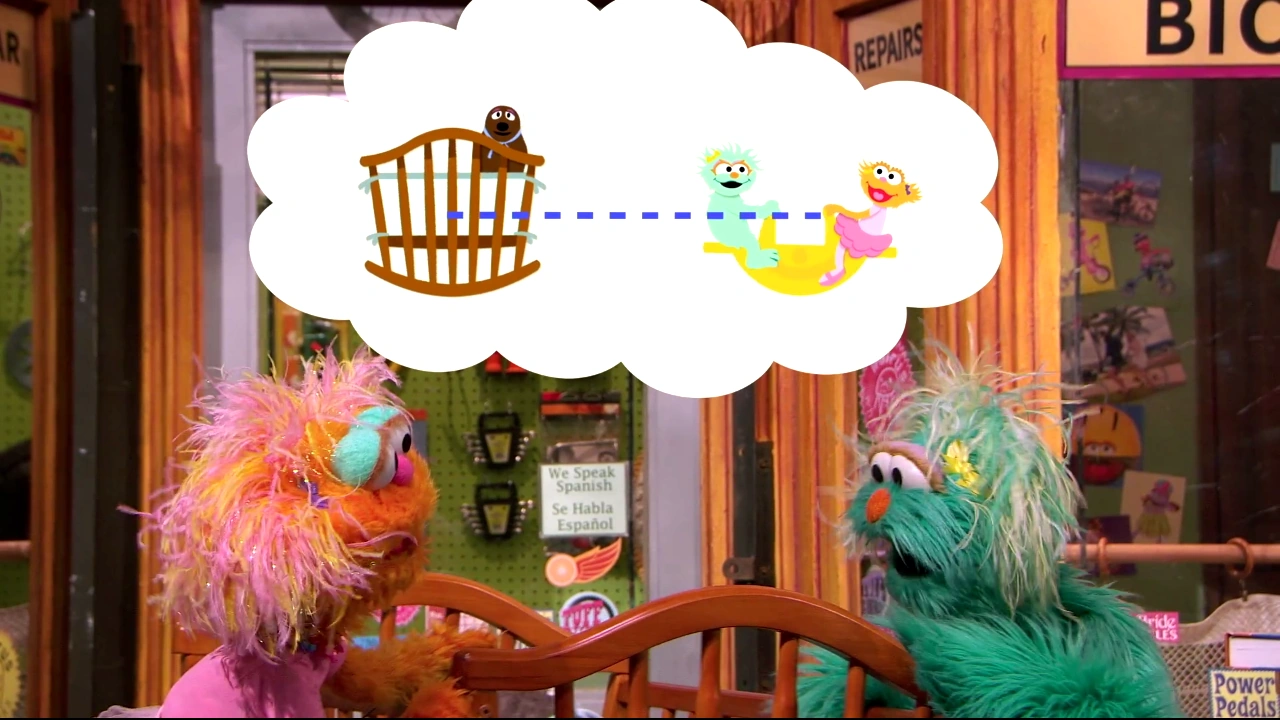 SCENE 1 | By the Bike Shop, Nina takes care of Rollie, a baby seal, who can only sleep when his cradle is rocked. Zoe and Rosita follow their stray ball to the store and inadvertently wake up Rollie when they request to play with Nina's see-saw. Chris rushes over, in need of Nina's repair expertise over at Hooper's Store. The monsters offer to watch over Rollie while she's gone and begin to rock his cradle. |