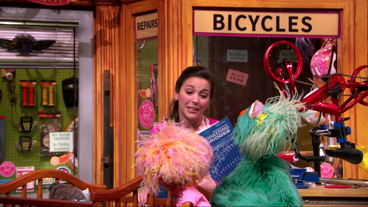 SCENE 1 cont'd | Nina heads back to the shop, where she finds Rosita and Zoe's pulley system is working perfectly. She compliments their engineering skills and wakes up Rollie to bring him home. The monsters, still with aching arms, feet-five and begin coming up with new invention ideas. |