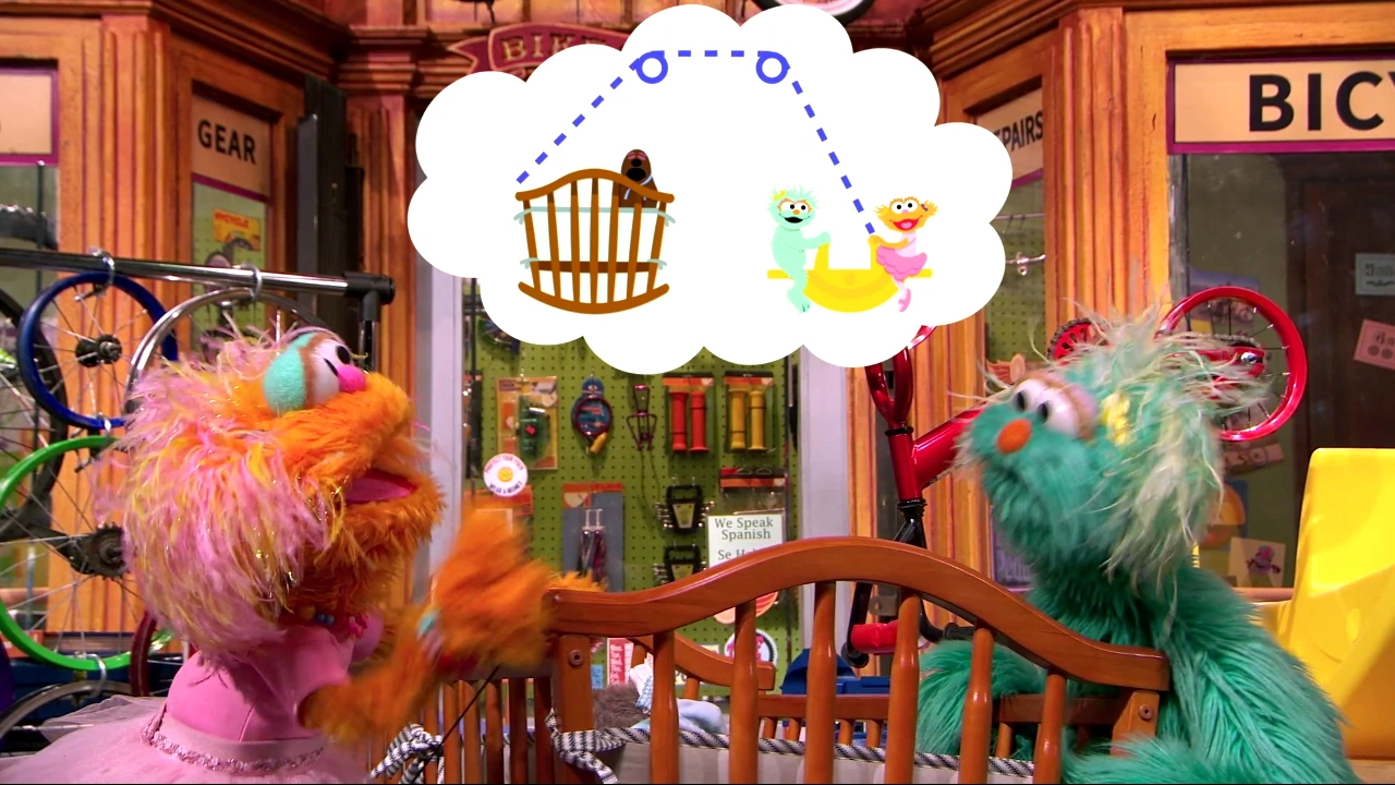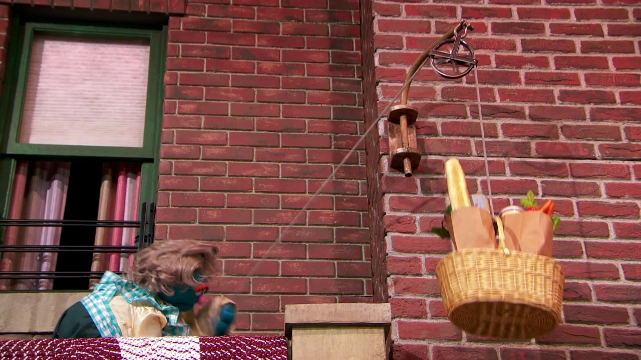 SCENE 1 cont'd | The monsters witness Grover making a grocery delivery to Mrs. Crustworthy up above. He places her bags in a basket, which she pulls up to her balcony using a rope and pulley. Due to a lack of eggs at the store, he provides her with a chicken instead, skedaddling as the commotion begins. Rosita becomes inspired - they could connect the cradle and see-saw with a pulley. She remembers there is rope in the store and there's no shortage of wheels around. |
