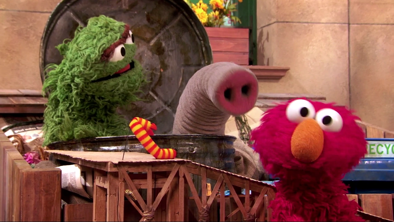 COLD OPEN | Elmo sets up today's theme of building, having made a popsicle stick ramp for Slimey to get into Oscar's trash can. |