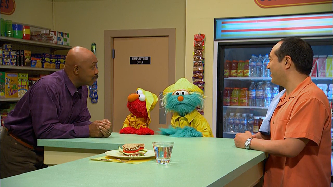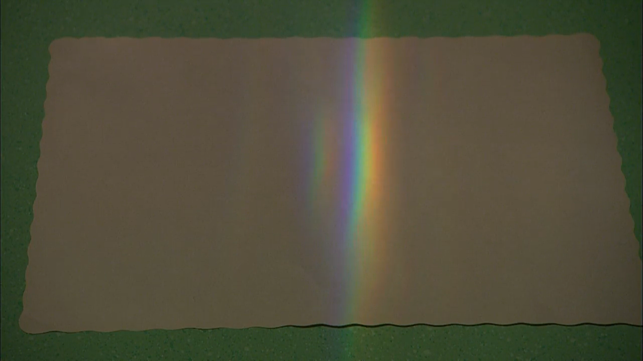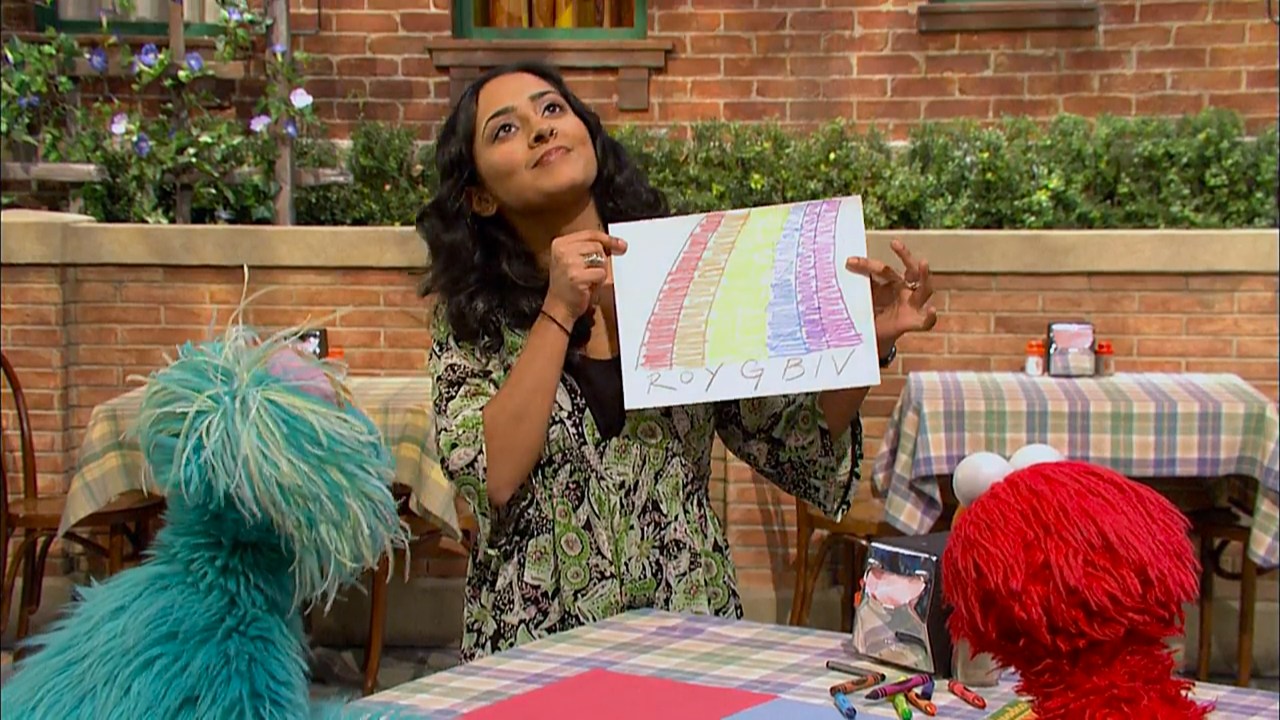 SCENE cont'd | Inside Hooperβs, Gordon gives Rosita a rainbow using science. He shines a flashlight through a cup of water, which breaks up the white light and separates the colors so they all show, making a rainbow. The rainstorm ends, so the monsters head out. |