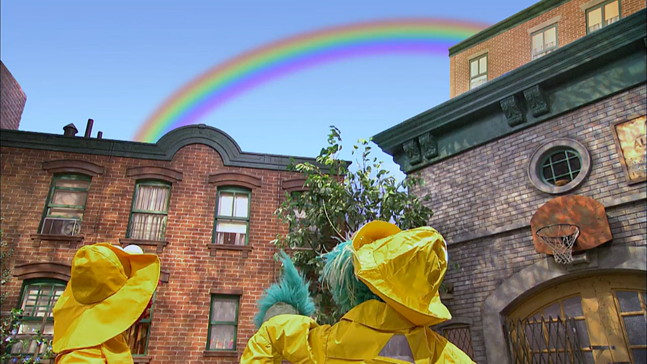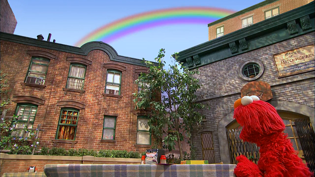 SCENE 1 | Elmo welcomes the viewer as he makes a drawing using all the colors when he notices a rainbow in the sky. He calls everyone over to see it. Rosita rushes to him, to see her first rainbow, but by the time she looks up, the rainbow has vanished. |