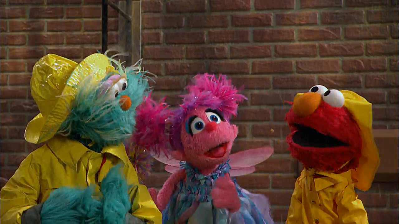 SCENE 1 cont'd | The monsters pick themselves up and leave, while Rosita still wishes for a rainbow. Abby Cadabby overhears and appears to grant her wish. She tries waving her wand, but causes a rain storm. She leaves to consult her mom, while the two monsters head into Hooper's Store for shelter. |