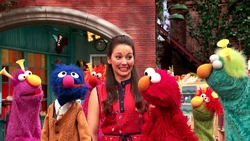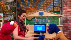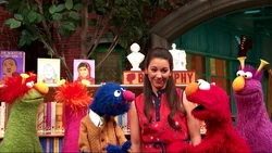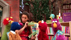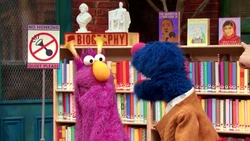 SCENE 1 | Elmo and Nina visit the Library to find some books - Nina needs a book to write a report with and Elmo wants the new Galactic Gail comic book. Librarian Frankie is unable to assist them, as she has a puppet show to perform in the story area. Grover happens by and claims he's a library expert. He dons the appropriate wardrobe and offers to help the two find their books. They're then joined by a quartet of Honkers, who also need assistance. The Honkers honk in excitement, but Elmo and Nina point out the signs regarding the area's "No Honking" policy. |