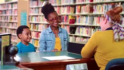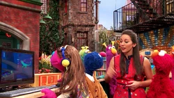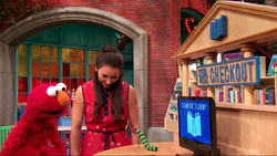 SCENE 1 cont'd | Nina shows Grover how the checkout process works. He's proud to have been so helpful to everyone, except Elmo is leaving the library empty handed. That is, until a volunteer posing as Galactic Gail (Zoë Kravitz) arrives and gives him a copy of the latest issue; Elmo is so starstruck he can barely speak. She checks out his book and leads everyone to the reading area for storytime. |