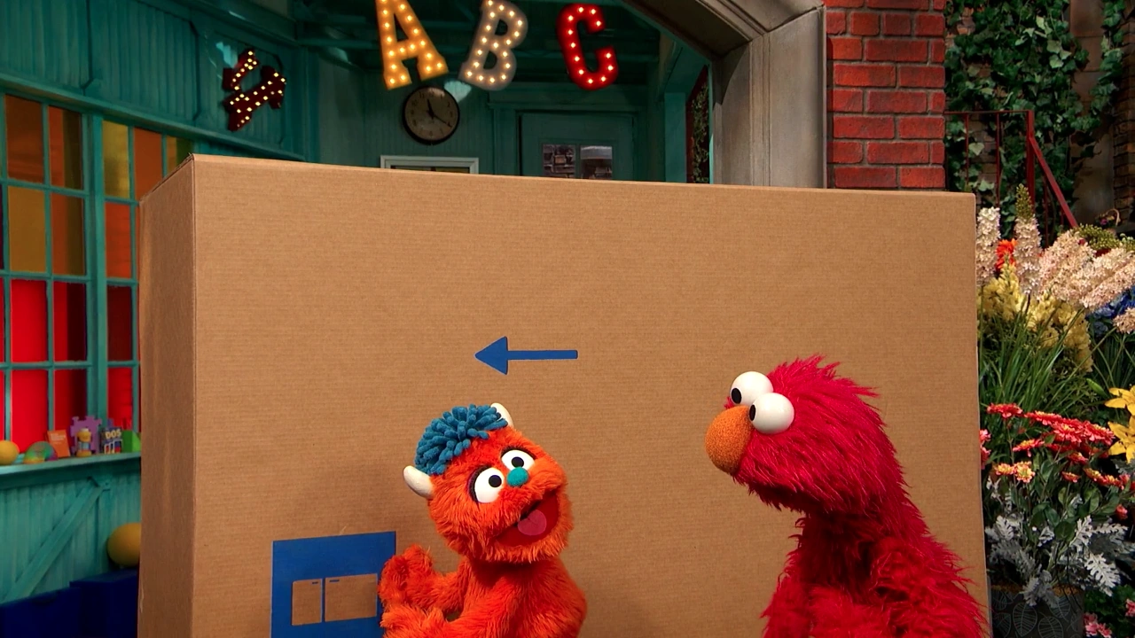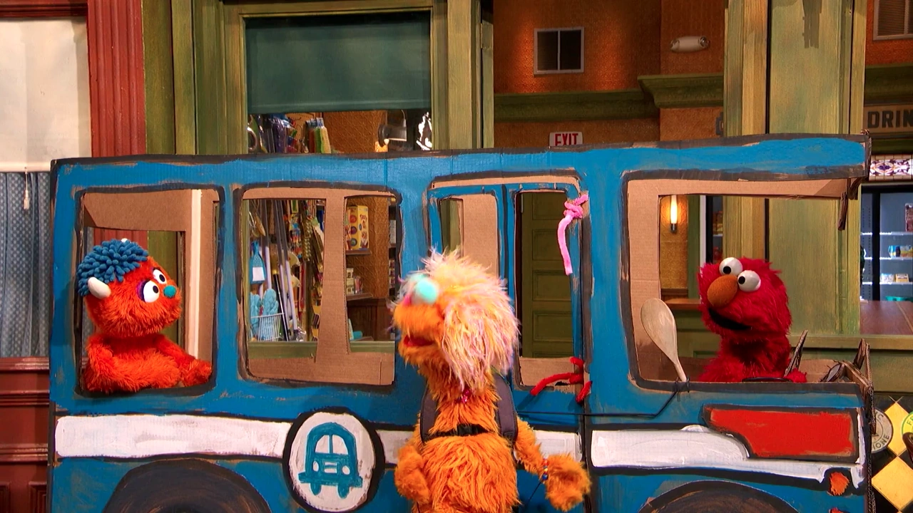 SCENE 1 | Elmo and Rudy have an empty refrigerator box and think of things they can play with it as (though Elmo's imagination is better than Rudy's). They see Rosita at the bus stop nearby and ask her to play. She's instead waiting for a city bus to meet up with her abuela. She tells them all about how the bus works before boarding it. This inspires the monsters to turn the box into a bus. |