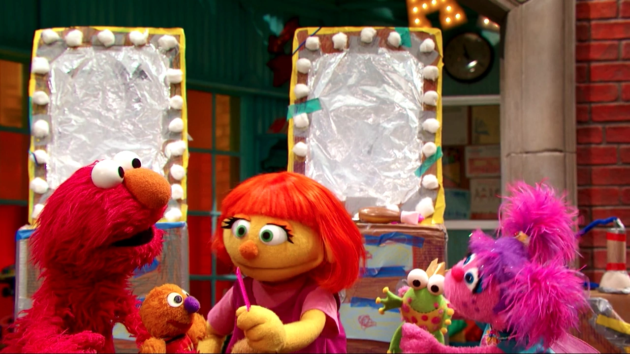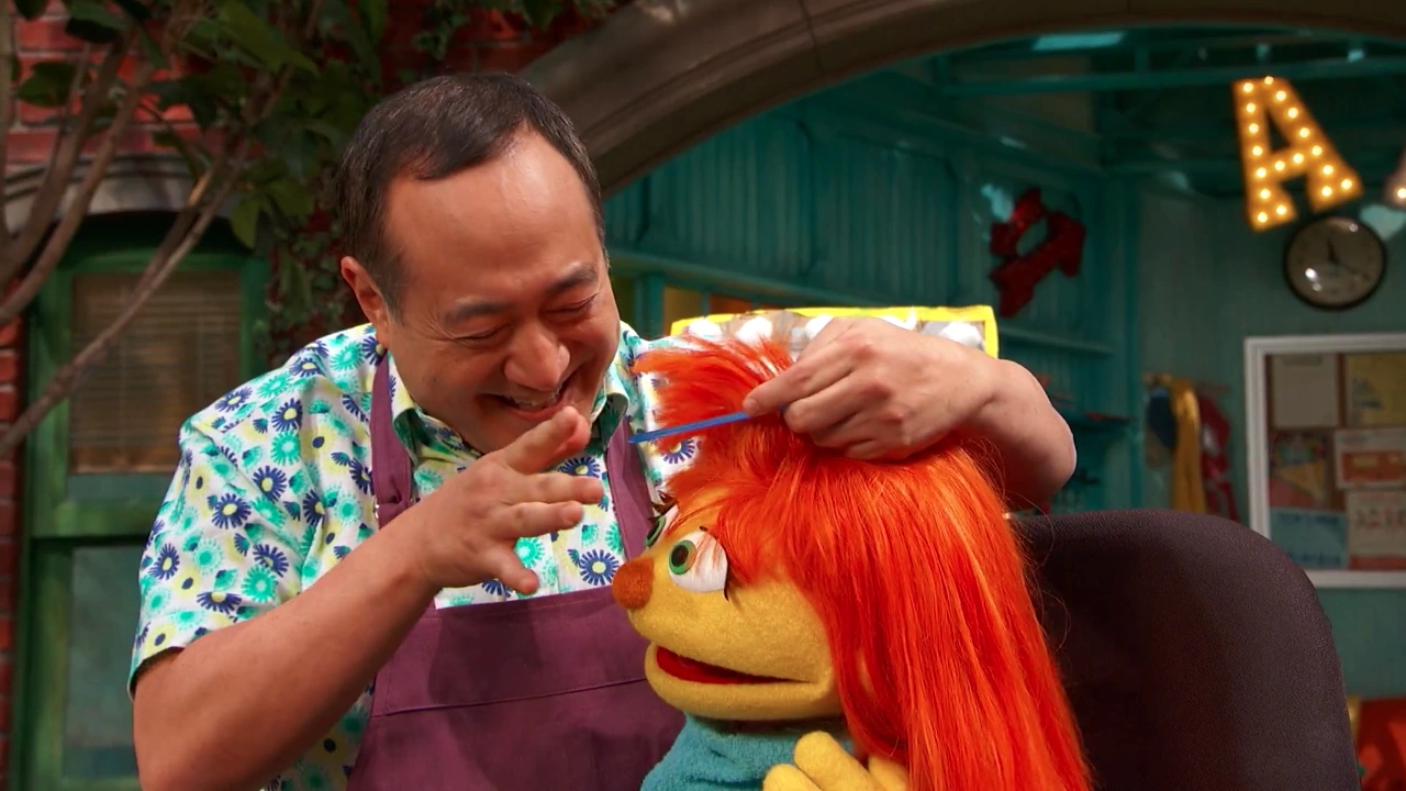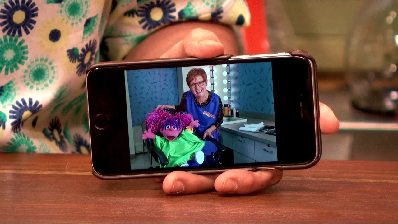 SCENE 1 | Alan, Elmo and Abby look at photos from Abby's recent haircut (her first one). Julia appears to be in need of a haircut herself, but she has found going to the hairstylist to be an upsetting experience. Elmo thinks they can help Julia overcome her fears by making sure she knows what to expect. They decide to set up a pretend hair salon outside. |