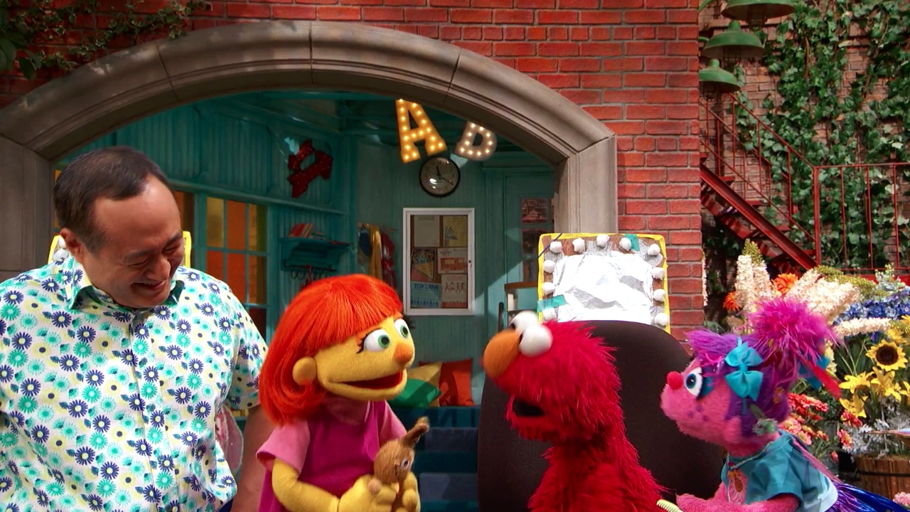 SCENE 1 cont'd | After a photo montage of Julia's visit, she and Alan return to the street. Elmo and Abby compliment Julia's shorter hairdo and they all decide to keep playing pretend hair salon. |