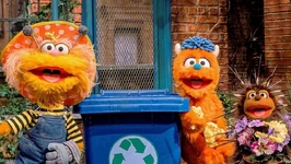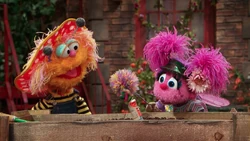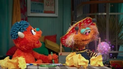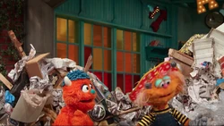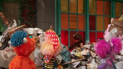 SCENE 1 cont'd | The source of the paper is Rudy, who is attempting to draw a house. He points out that the paper recycling bin is too far to throw to and he believes others, like Zoe, will just clean up his mess for him. Zoe wonders what it would be like if everyone acted like Rudy. She inadvertently says this in rhyme, triggering Abby's wand to treat it like a spell. Suddenly, all of Sesame Street is covered in piles of trash and the various residents throw their refuses carelessly around. |
