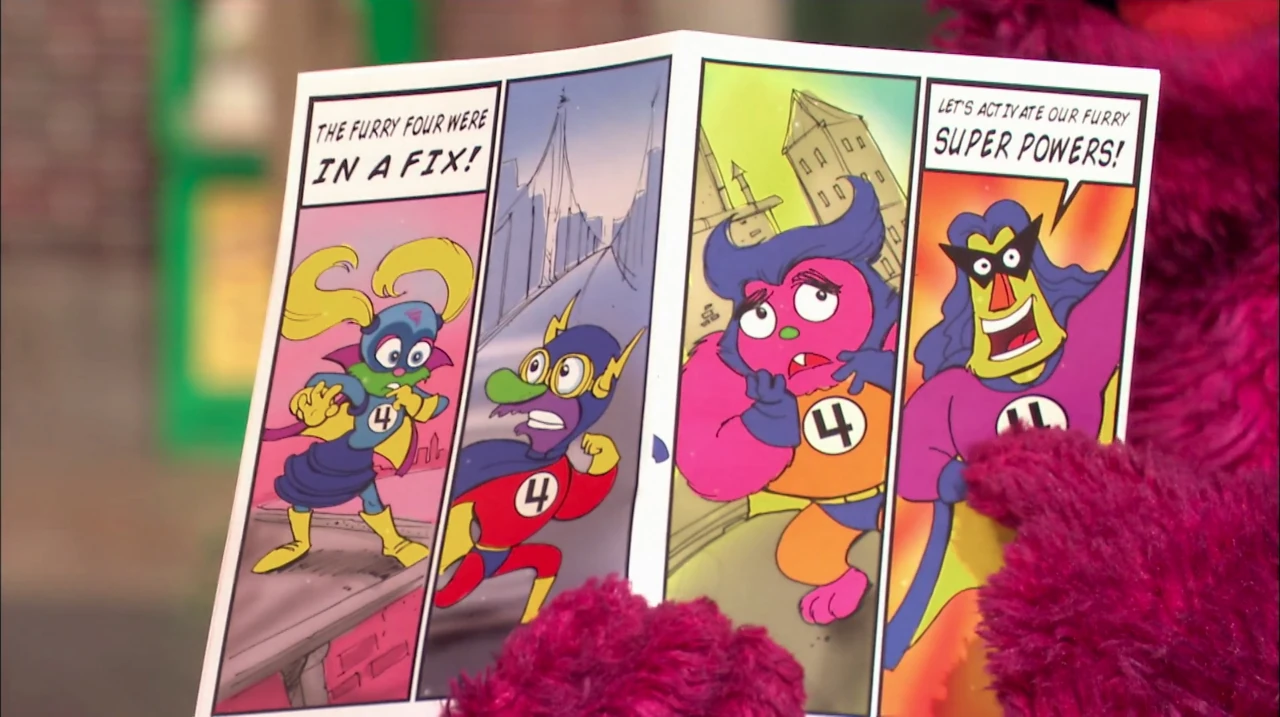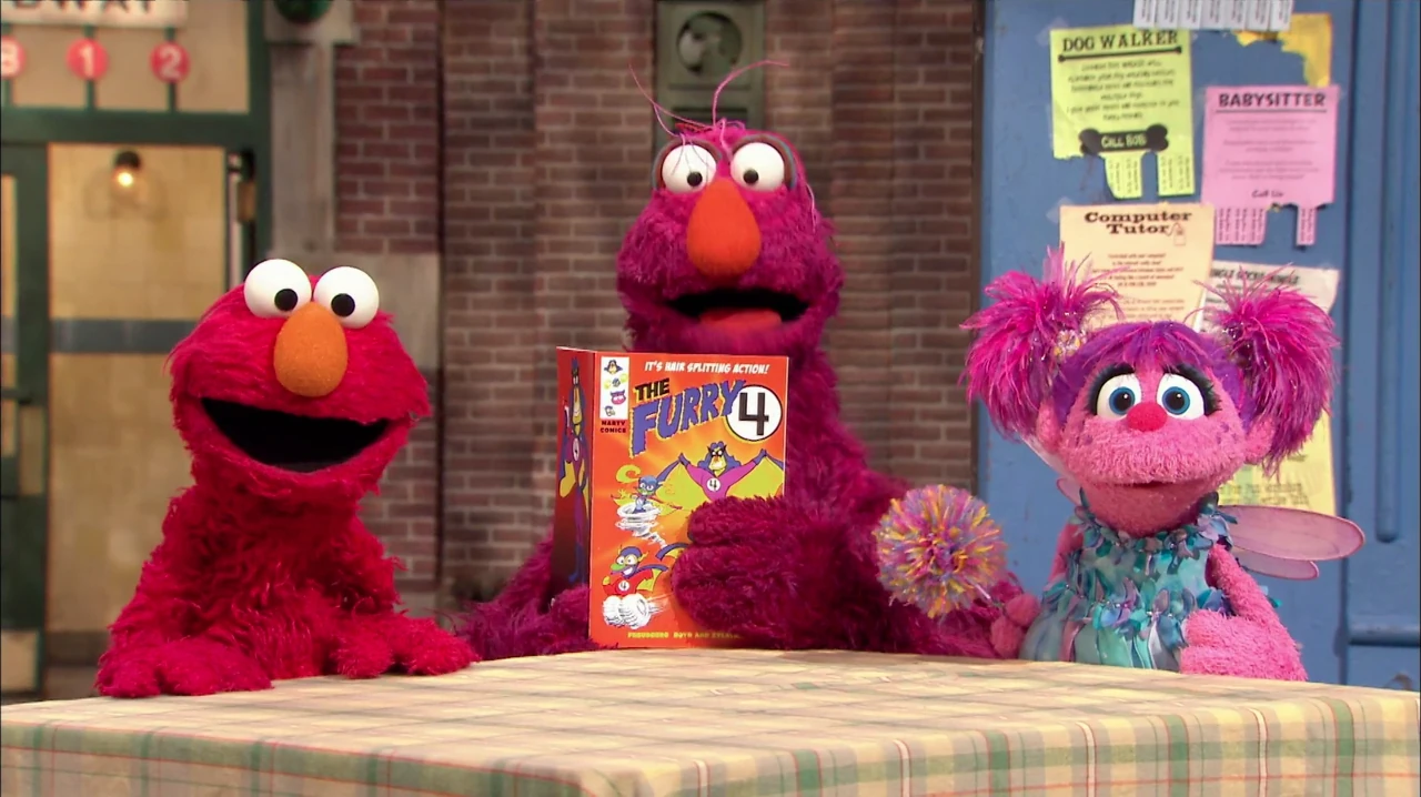 SCENE 1 | Telly reads his "Furry Four" comic book to Elmo and Abby and introduces each of the four members: The Furry Flash (who can run fast), The Furry Tornado (who spins faster than a tornado), Mr. Furry (who can become invisible) and Mr. Furry Muscles (who has tremendous strength). They find the characters cool and decide to pretend to be them. They all rush off to get some costumes. |