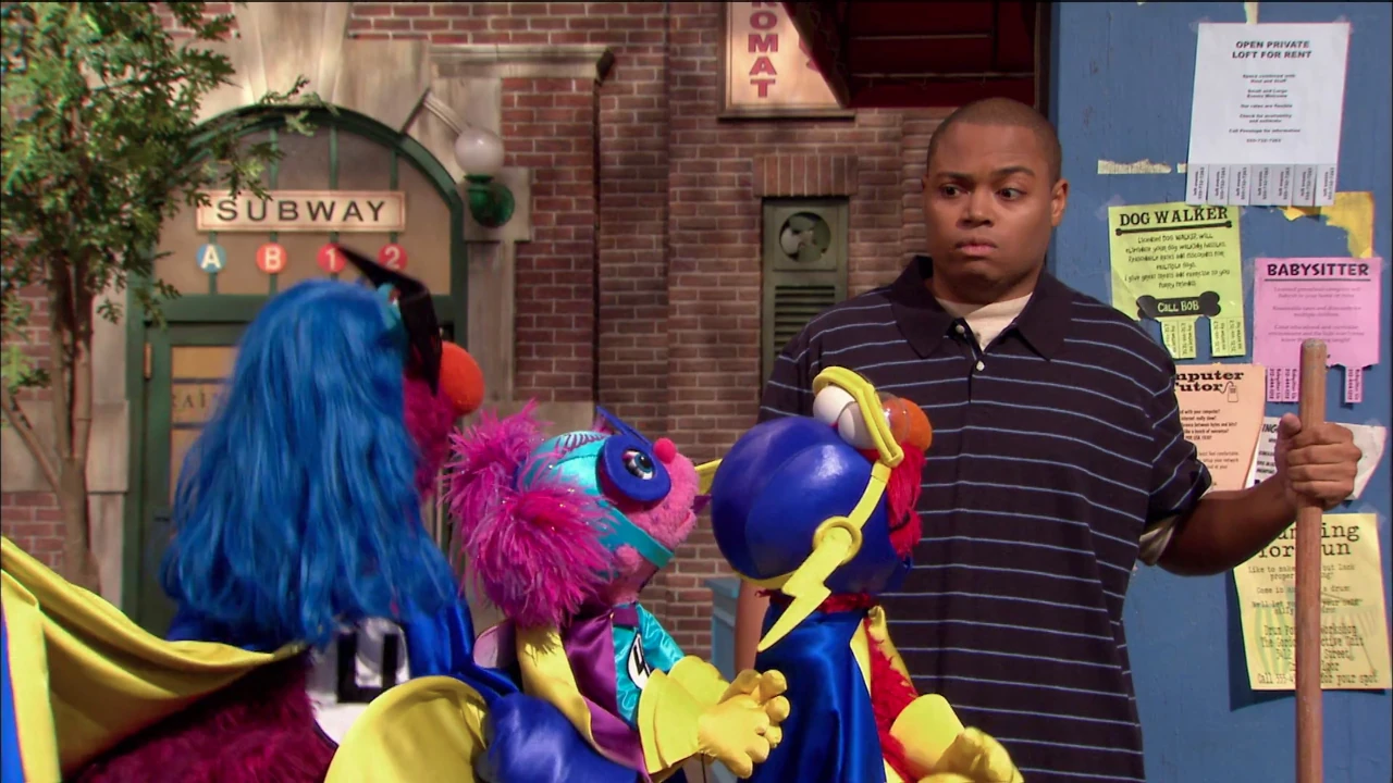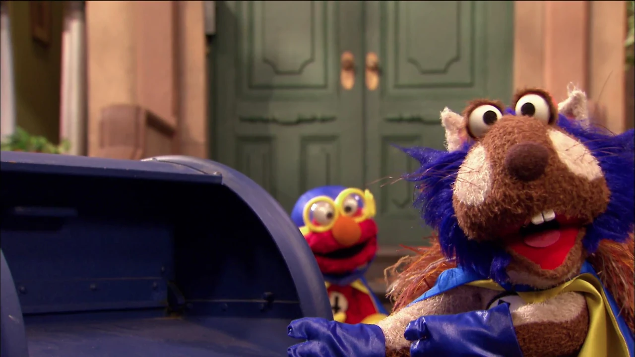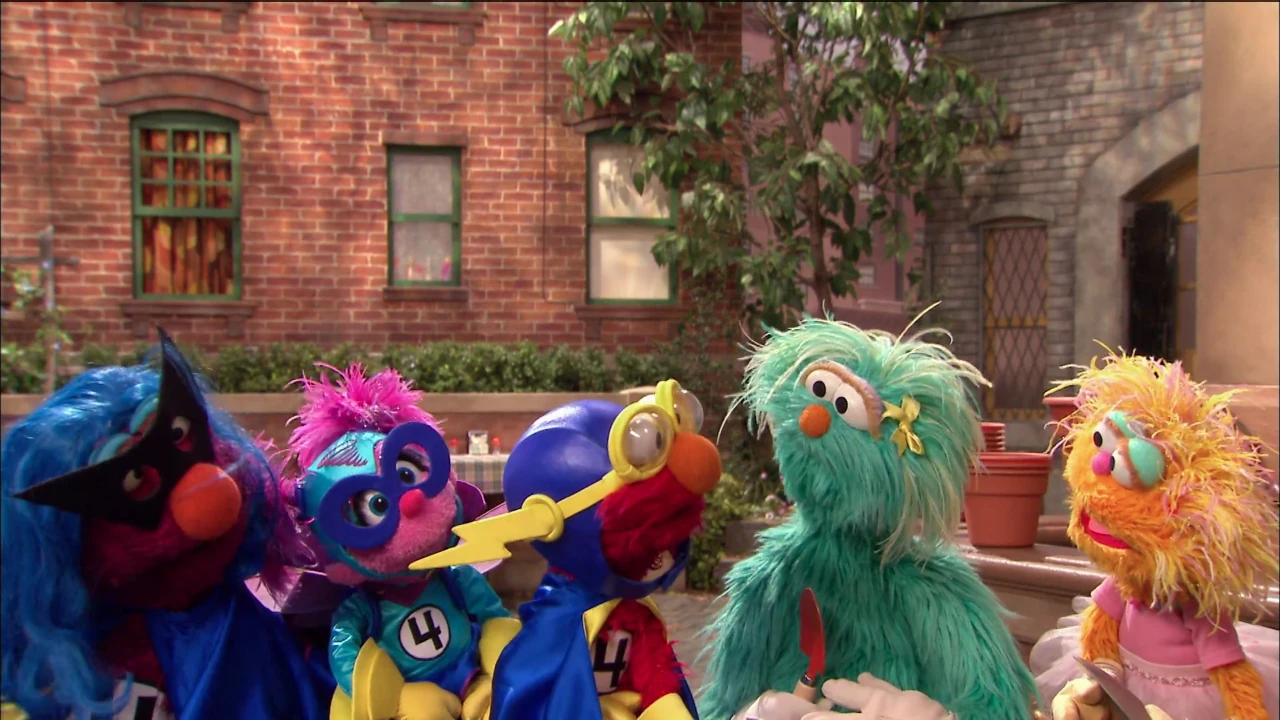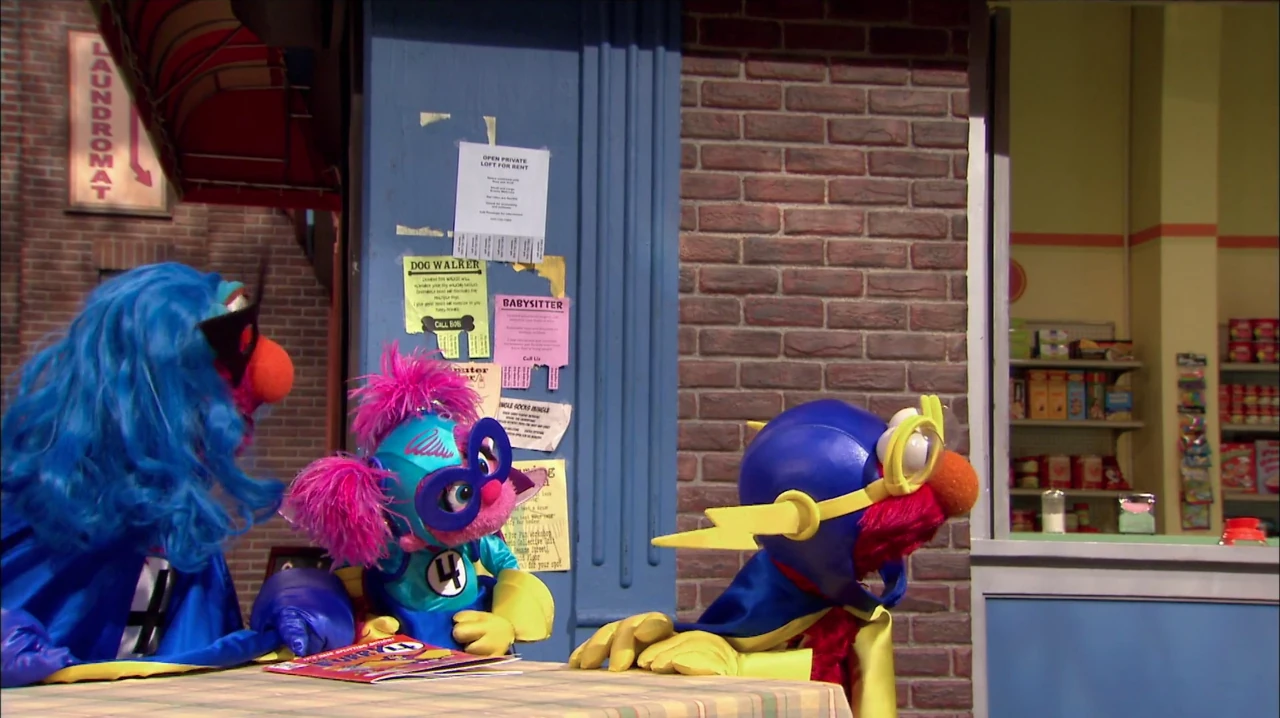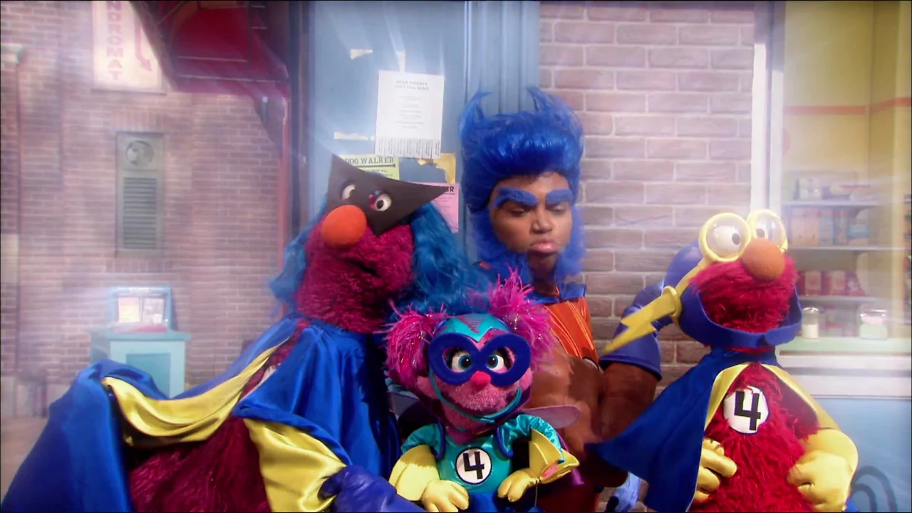 SCENE 1 cont'd | They all return as the heroes in the book; Elmo as the Furry Flash, Abby as the Furry Tornado and Telly as Mr. Furry (who pretends to be invisible by covering himself in his cape). They then notice they're lacking a fourth member to play Mr. Furry Muscles. Telly thinks this is a good mission for them and they sing a heroic theme. They activate their powers and look for a fourth pretender. |